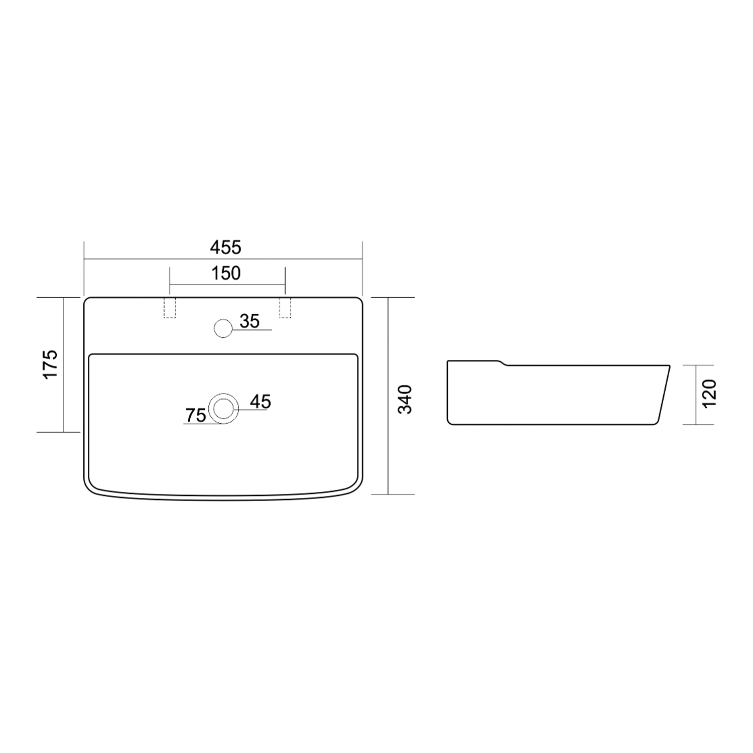 Umývadlo CRISTY má šírku 455 mm, hĺbku 340 mm a výšku misy iba 120 mm. Kompaktná hĺbka 340 mm je praktická v užších priestoroch — umývadlo nezasahuje príliš do miestnosti a zároveň poskytuje dostatočný priestor na umývanie rúk.