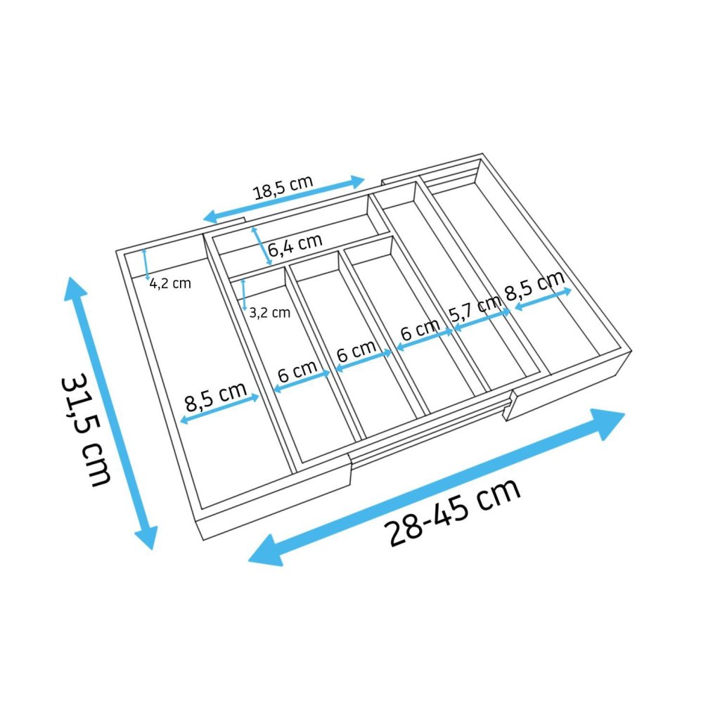 - Zložený organizér meria na šírku 28 cm a pozostáva z 5 priehradiek rôznych veľkostí