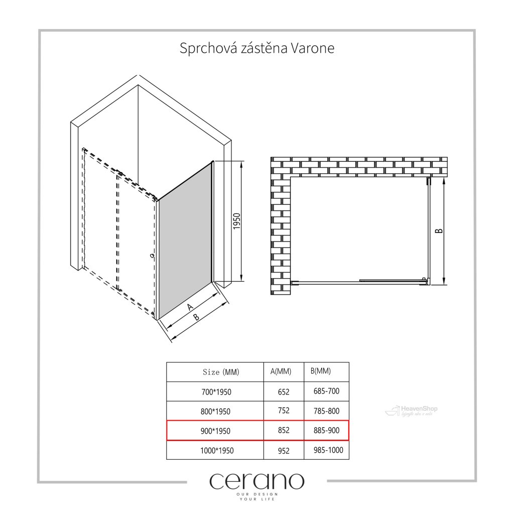 Cerano Varone, pevná sprchová stena 90x195 cm, 6mm číre sklo, čierny profil, CER-CER-DY505B-90-195-SG