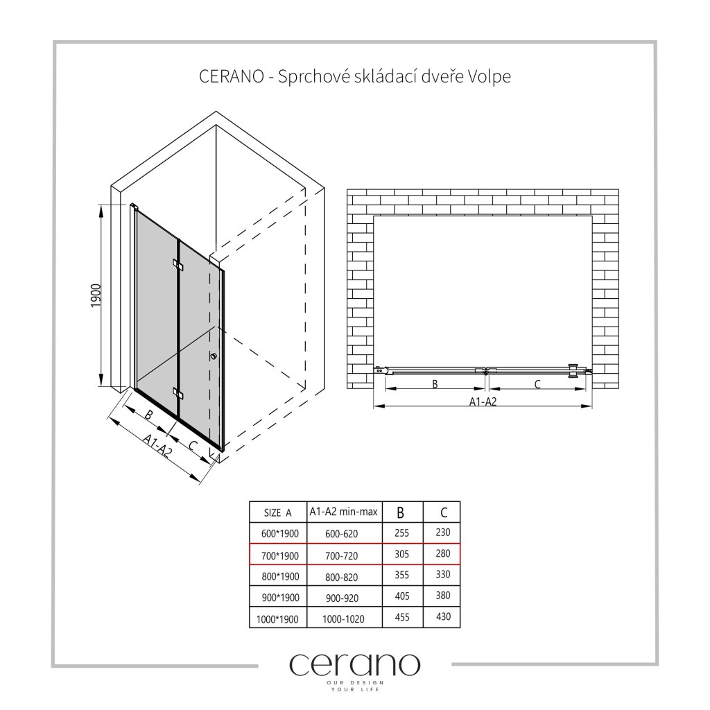 Sprchové skladacie dvere Volpe značky Cerano sú ideálnou voľbou pre tých, ktorí si cenia štýlové vybavenie kúpeľne, ale zároveň sa nechcú vzdať praktických riešení.