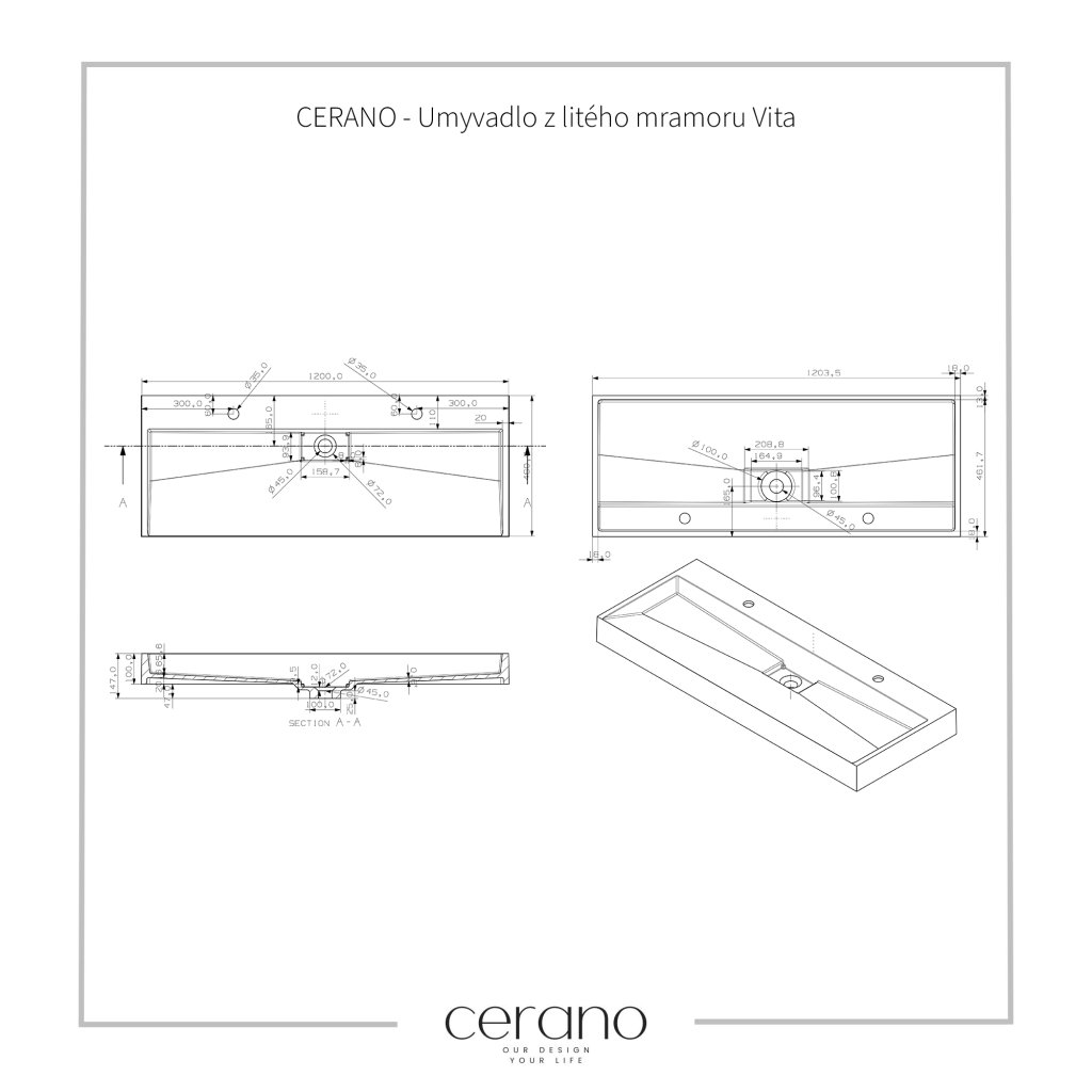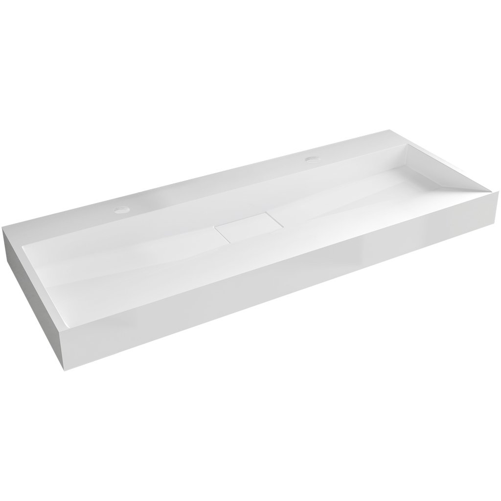 CERANO - Umývadlo z liateho mramoru Vita - nástenné aj na dosku - 2 otvory pre batériu - biela matná - 120x46 cm, CER-CER-8050BD6941