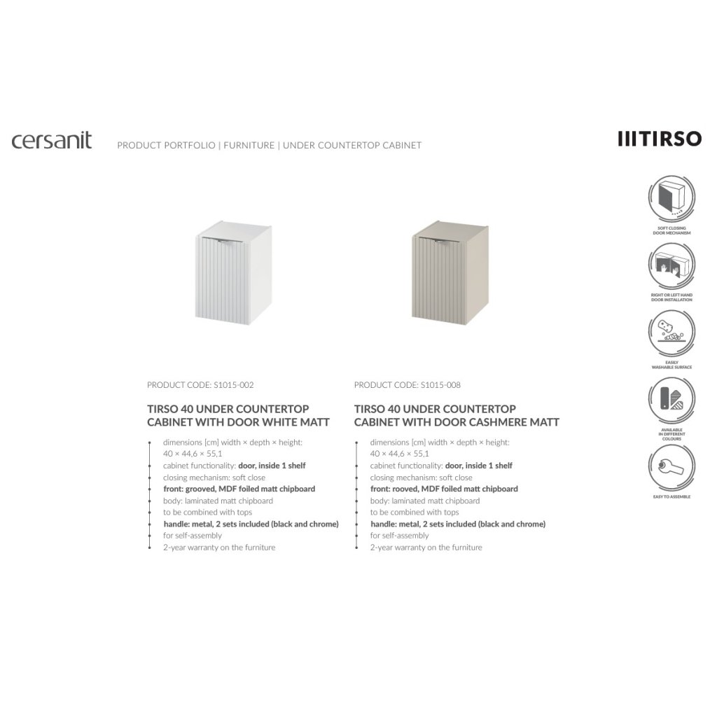 Kolekcia kúpeľňového nábytku TIRSO predstavuje premyslený koncept, ktorý sa vďaka kombinácii štýlového dizajnu a funkčných riešení stáva ideálnym návrhom pre tých, ktorí hľadajú maximálne pohodlie. Estetický koncept zachovaný v minimalistickom štýle umožní slobodu usporiadania v každej kúpeľni. Modularita nábytku umožní optimálne hospodárenie s priestorom, zatiaľ čo jemné rebrovanie vlnitých povrchov dodá interiéru jemnú expresivitu. Séria TIRSO je dodávaná vo farebných variantoch: biela matná, kašmír matný, fjord a čierna matná.