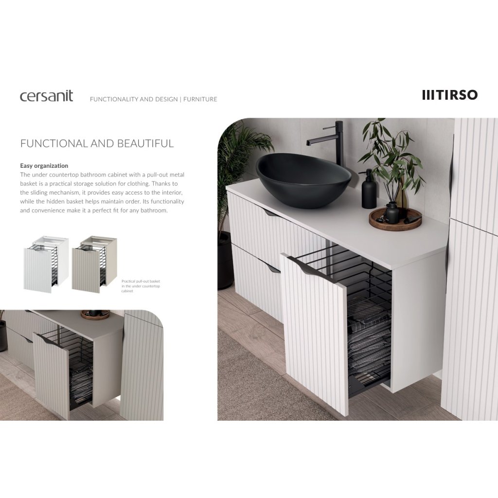 Kolekcia kúpeľňového nábytku TIRSO predstavuje premyslený koncept, ktorý sa vďaka kombinácii štýlového dizajnu a funkčných riešení stáva ideálnym návrhom pre tých, ktorí hľadajú maximálne pohodlie. Estetický koncept zachovaný v minimalistickom štýle umožní slobodu usporiadania v každej kúpeľni. Modularita nábytku umožní optimálne hospodárenie s priestorom, zatiaľ čo jemné rebrovanie vlnitých povrchov dodá interiéru jemnú expresivitu. Séria TIRSO je dodávaná vo farebných variantoch: biela matná, kašmír matný, fjord a čierna matná.