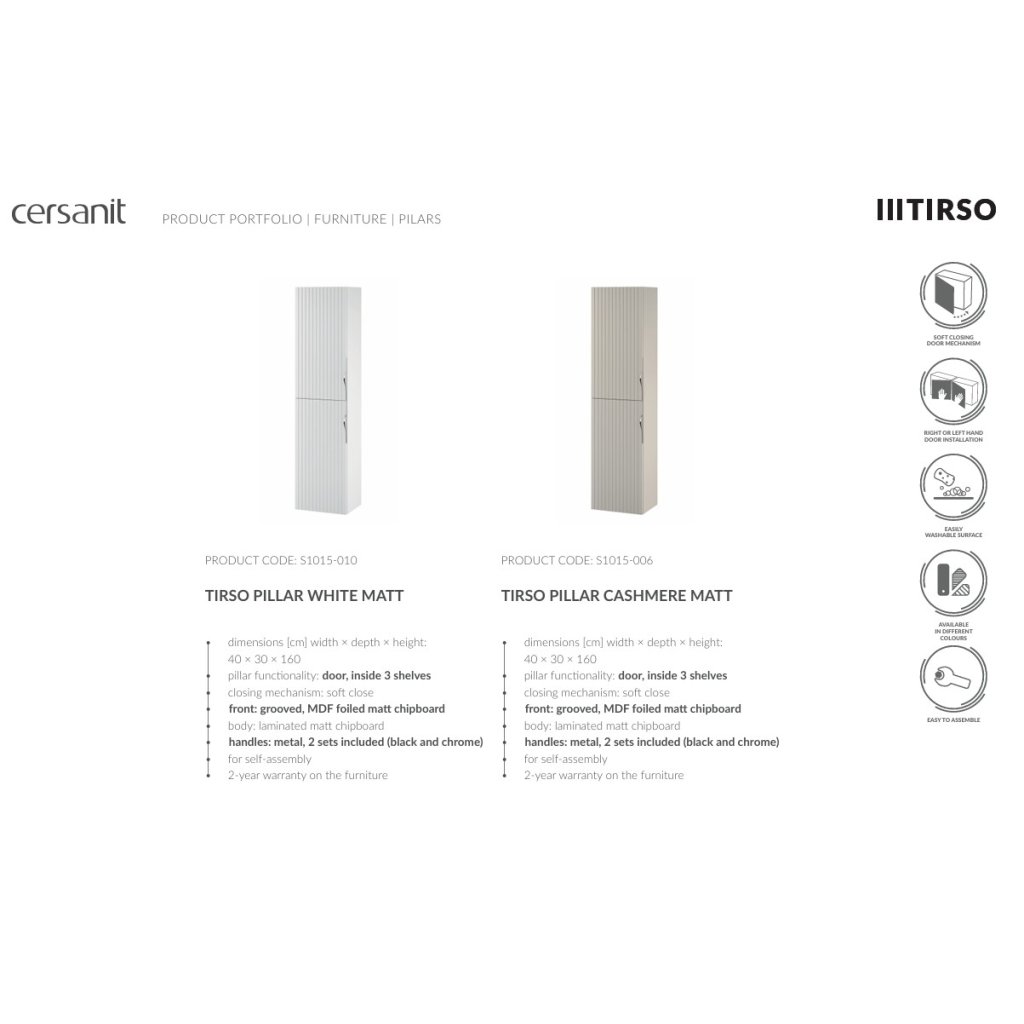 Kolekcia kúpeľňového nábytku TIRSO predstavuje premyslený koncept, ktorý sa vďaka kombinácii štýlového dizajnu a funkčných riešení stáva ideálnym návrhom pre tých, ktorí hľadajú maximálne pohodlie. Estetický koncept zachovaný v minimalistickom štýle umožní slobodu usporiadania v každej kúpeľni. Modularita nábytku umožní optimálne hospodárenie s priestorom, zatiaľ čo jemné rebrovanie vlnitých povrchov dodá interiéru jemnú expresivitu. Séria TIRSO je dodávaná vo farebných variantoch: biela matná, kašmír matný, fjord a čierna matná.