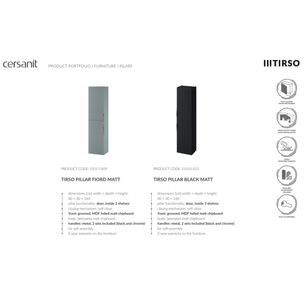 Kolekcia kúpeľňového nábytku TIRSO predstavuje premyslený koncept, ktorý sa vďaka kombinácii štýlového dizajnu a funkčných riešení stáva ideálnym návrhom pre tých, ktorí hľadajú maximálne pohodlie. Estetický koncept zachovaný v minimalistickom štýle umožní slobodu usporiadania v každej kúpeľni. Modularita nábytku umožní optimálne hospodárenie s priestorom, zatiaľ čo jemné rebrovanie vlnitých povrchov dodá interiéru jemnú expresivitu. Séria TIRSO je dodávaná vo farebných variantoch: biela matná, kašmír matný, fjord a čierna matná.