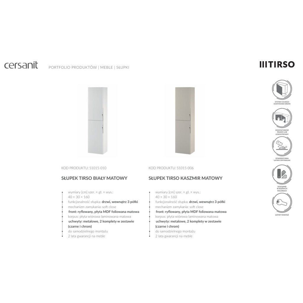 Kolekcia kúpeľňového nábytku TIRSO predstavuje premyslený koncept, ktorý sa vďaka kombinácii štýlového dizajnu a funkčných riešení stáva ideálnym návrhom pre tých, ktorí hľadajú maximálne pohodlie. Estetický koncept zachovaný v minimalistickom štýle umožní slobodu usporiadania v každej kúpeľni. Modularita nábytku umožní optimálne hospodárenie s priestorom, zatiaľ čo jemné rebrovanie vlnitých povrchov dodá interiéru jemnú expresivitu. Séria TIRSO je dodávaná vo farebných variantoch: biela matná, kašmír matný, fjord a čierna matná.