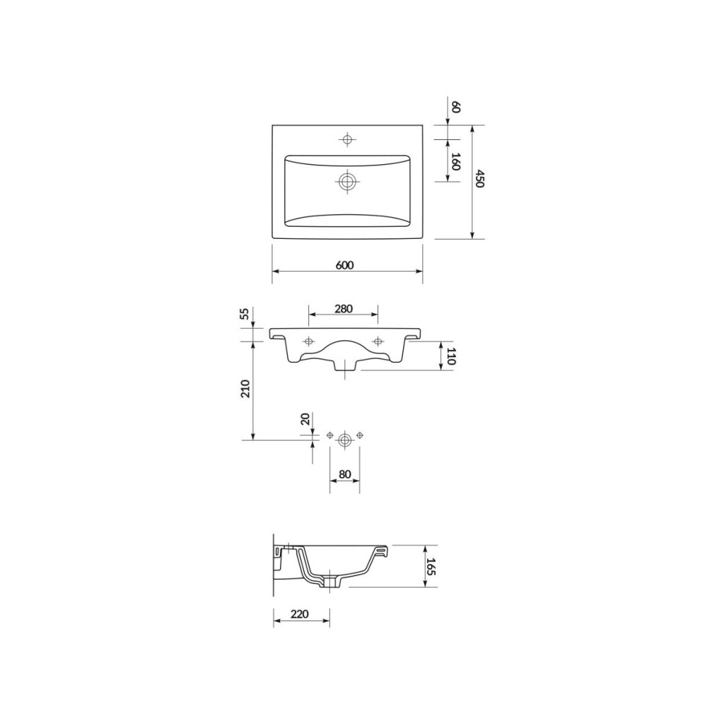 - Rozmery umývadla: 60 (šírka) × 45 (hĺbka) × 1,5 (výška)