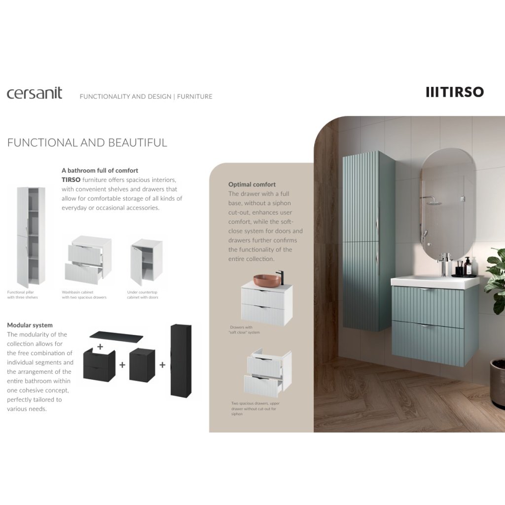 Kolekcia kúpeľňového nábytku TIRSO predstavuje premyslený koncept, ktorý sa vďaka kombinácii štýlového dizajnu a funkčných riešení stáva ideálnym návrhom pre tých, ktorí hľadajú maximálne pohodlie. Estetický koncept zachovaný v minimalistickom štýle umožní slobodu usporiadania v každej kúpeľni. Modularita nábytku umožní optimálne hospodárenie s priestorom, zatiaľ čo jemné rebrovanie vlnitých povrchov dodá interiéru jemnú expresivitu. Séria TIRSO je dodávaná vo farebných variantoch: biela matná, kašmír matný, fjord a čierna matná.
