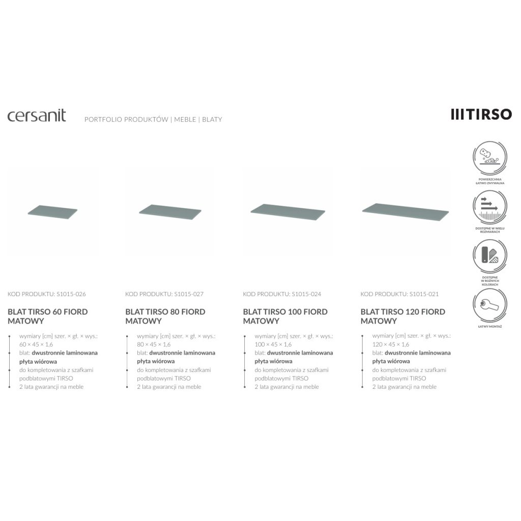 Súprava obsahuje skrinku pod umývadlo TIRSO 60 vo verzii DSM (demont - vlastná montáž) a keramické umývadlo Cersanit Como 60. Skrinka je vybavená dvoma priestrannými zásuvkami s plným dnom, ktoré poskytujú viac úložného priestoru pre rôzne kúpeľňové doplnky - preto odporúčame použiť priestorovo úsporný sifón. Predná strana skrinky je vyrobená z ryhovanej fóliovanej MDF dosky v matnom prevedení, čo jej dodáva jemnú textúru a elegantný vzhľad. Telo skrinky je laminovaná drevotrieska, tiež v matnom prevedení. Obdĺžnikové keramické umývadlo COMO 60 má otvor na vodovodnú batériu a prepadový otvor v strednej časti, je možné ho doplniť keramickými alebo kovovými zátkami click-clack z ponuky Cersanit.