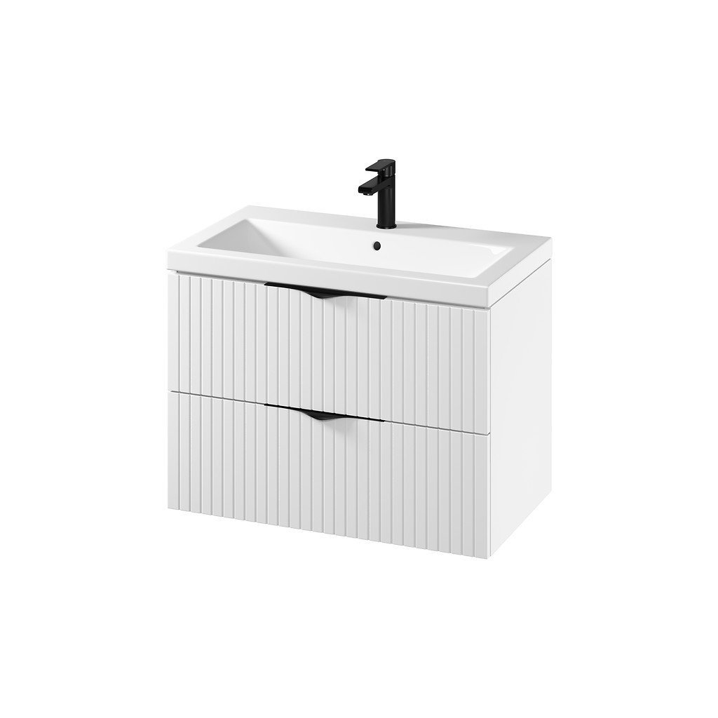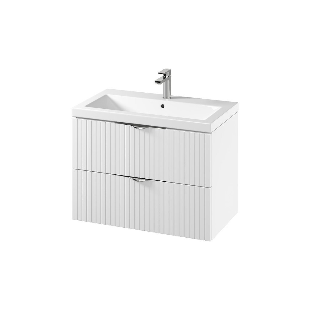 Súprava obsahuje skrinku pod umývadlo TIRSO 80 vo verzii DSM (demont - vlastná montáž) a keramické umývadlo Cersanit Como 80. Skrinka je vybavená dvoma priestrannými zásuvkami s plným dnom, ktoré poskytujú viac úložného priestoru pre rôzne kúpeľňové doplnky - preto odporúčame použiť priestorovo úsporný sifón. Predná strana skrinky je vyrobená z ryhovanej fóliovanej MDF dosky v matnom prevedení, čo jej dodáva jemnú textúru a elegantný vzhľad. Telo skrinky je laminovaná drevotrieska, tiež v matnom prevedení. Obdĺžnikové keramické umývadlo COMO 80 má otvor na vodovodnú batériu a prepadový otvor v strednej časti, je možné ho doplniť keramickými alebo kovovými zátkami click-clack z ponuky Cersanit.