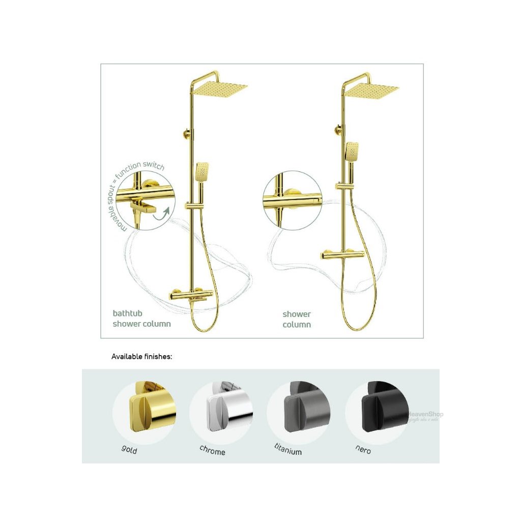 Cascada dažďová sprchová súprava s termostatickou vaňovou batériou je dizajnový a zároveň veľmi bezpečný a premyslený produkt. Dažďová sprcha má batériu so skladacím výtokom, ktorý slúži aj ako sprchový prepínač. Teplotný zámok 38 stupňov zabraňuje náhodnému popáleniu a zaisťuje maximálne pohodlné kúpanie. Ergonomické gombíky okrem dekoratívnej funkcie umožňujú presné ovládanie tela batérie. Ultratenká sprchová hlavica a 3-funkčná ručná hlavica sú vybavené Anti-Calc systémom, ktorý zabraňuje hromadeniu vodného kameňa a tým predlžuje životnosť produktu. To všetko robí dažďovú sprchu Cascada, okrem jej skvelého vzhľadu, tiež mimoriadne funkčnou. Zlatý lesklý povrch prinesie do vašej kúpeľne nádych extravagancie.