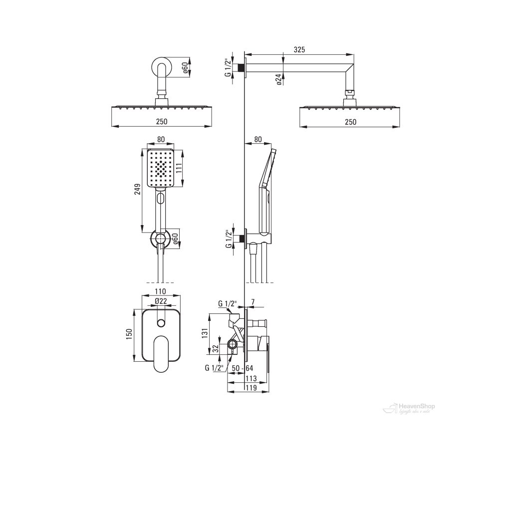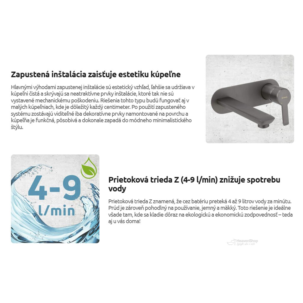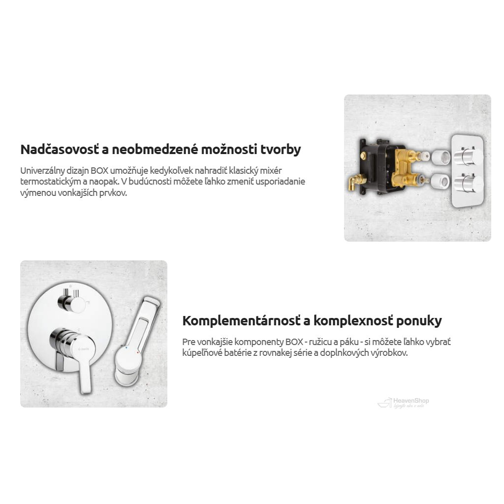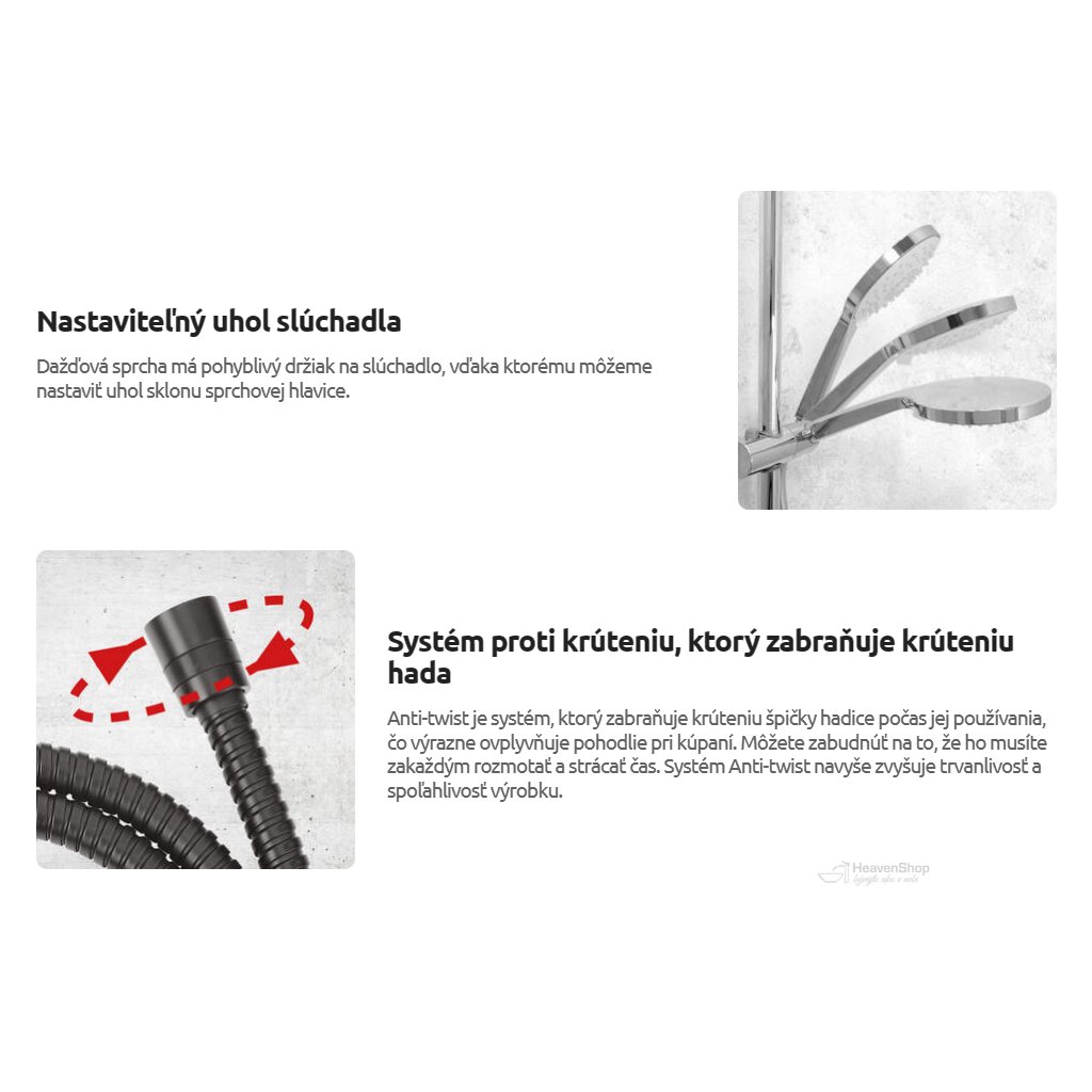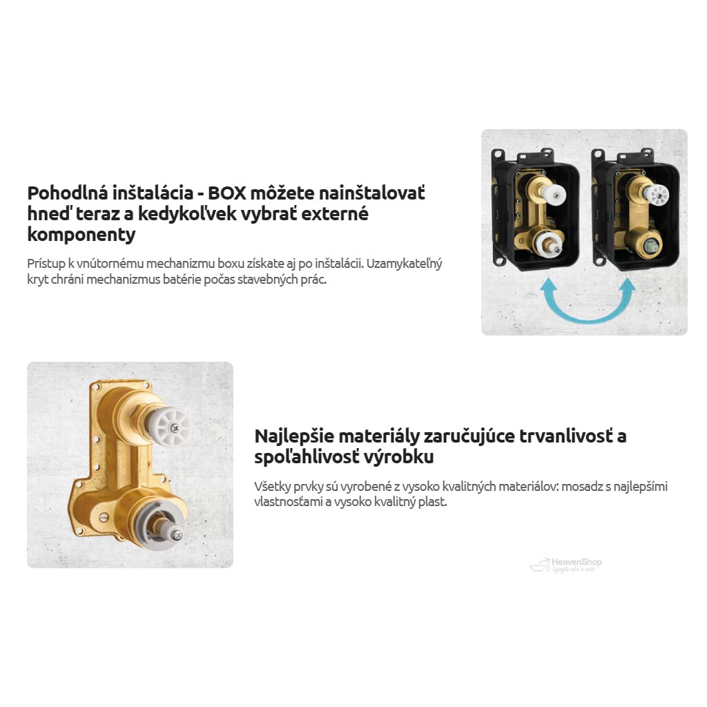 Sprchová súprava sa skladá z BOXU, dažďovej sprchy a slúchadla s rukoväťou a hadicou. Zapustená inštalácia sa vyznačuje moderným dizajnom a jedinečnou estetikou. Zmiešavací box sa vyznačuje presnosťou spracovania, je vybavený 3-funkčným rozprašovacím spínačom. Dažďová sprcha v zaujímavom, štvorcovom tvare je vyrobená z vysoko kvalitnej nehrdzavejúcej ocele. Sprchové slúchadlo má 3 funkcie: dážď, zmiešanú a vodnú hmlu. Dažďová sprcha aj slúchadlo sú vybavené anti-kalcovým systémom, vďaka čomu sa ľahko udržiavajú v čistote. Pohyblivé uhlové pripojenie k telefónu umožňuje presné polohovanie a hadica so systémom proti krúteniu zabraňuje jeho krúteniu. Celok je zakončený elegantnou matnou čiernou farbou. Toto je jedna z najčastejšie používaných farieb na zdobenie bytu. Táto farba je ideálna aj do kúpeľní a dokonale ladí s moderným, minimalistickým dizajnom.