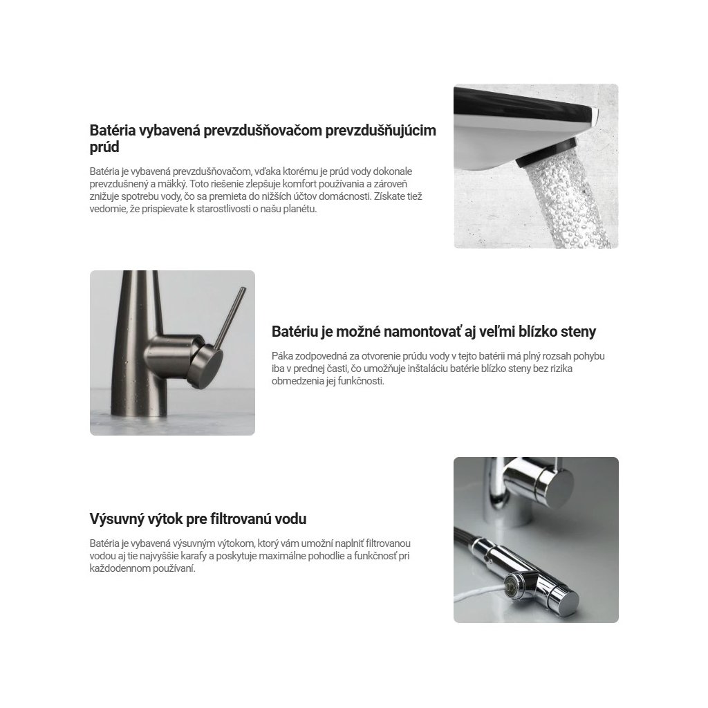 - Typ: vysoká drezová batéria s výtokom na filtrovanú vodu