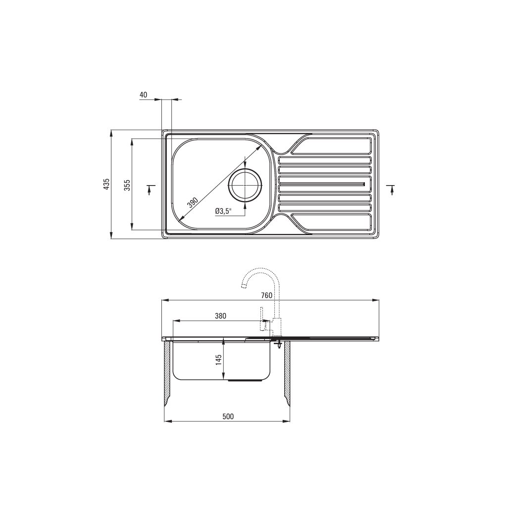 - Typ: nerezový drez na dosku 1-komorový+ drezová batéria + sifón