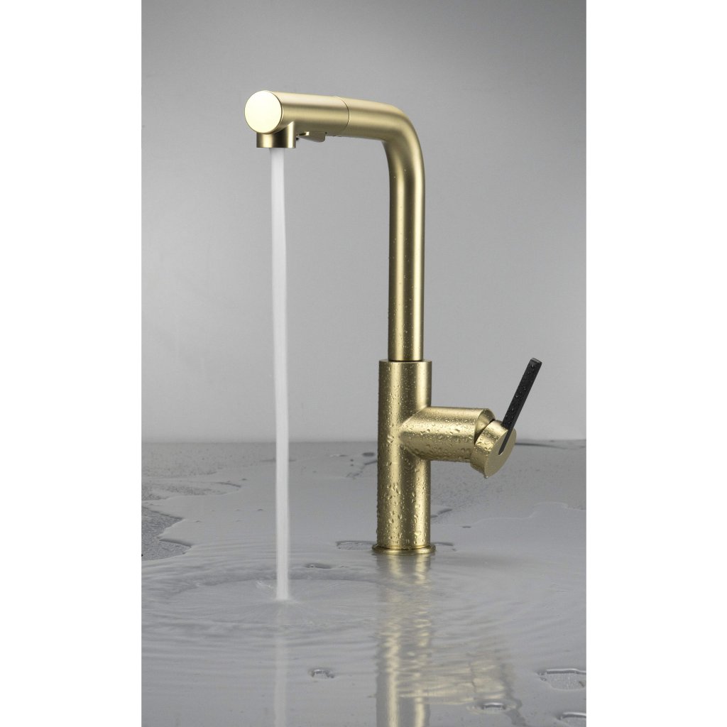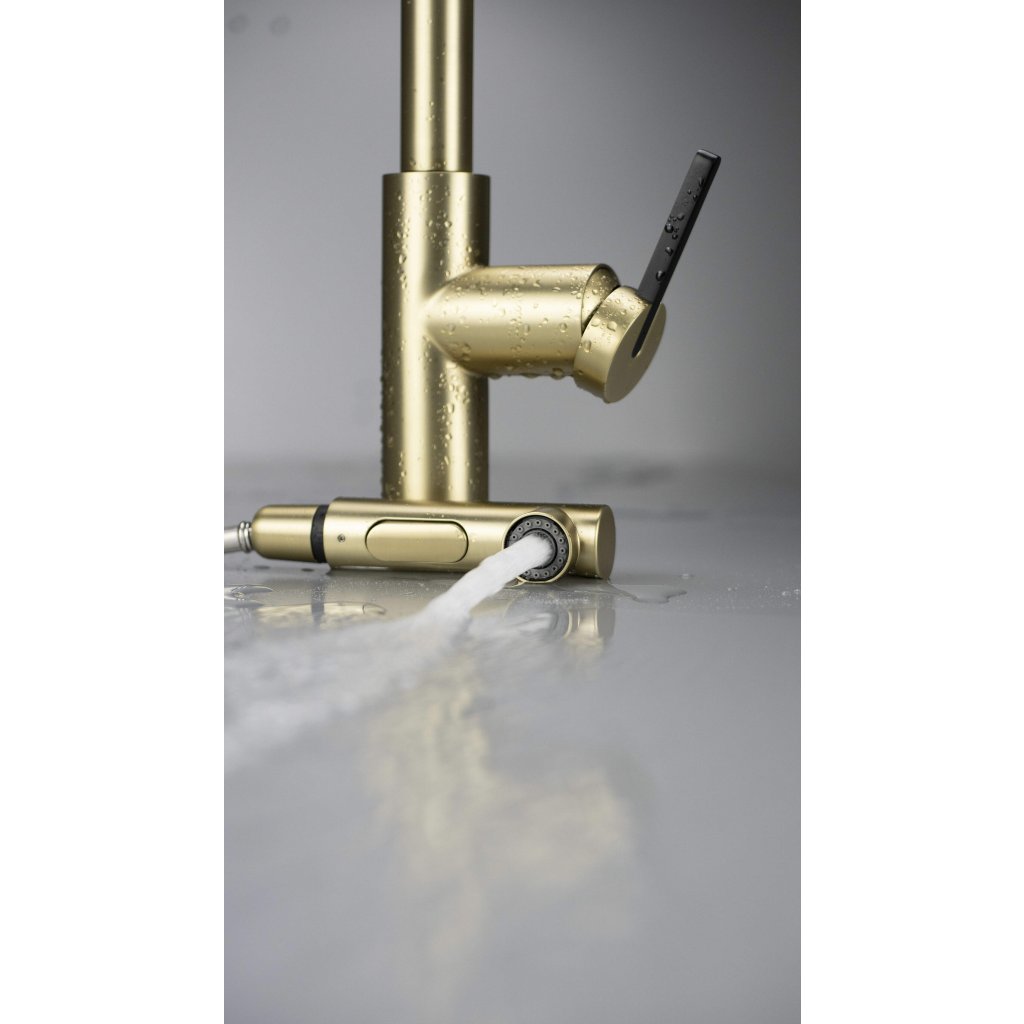 Batéria Momi je vyrobená z prvotriednej nehrdzavejúcej ocele. Vďaka zabudovanému prevzdušňovaču je voda prevzdušňovaná, čo nielen znižuje spotrebu vody, ale zaisťuje aj optimálny prietok. Výsuvný výtok ponúka výnimočné pohodlie pri každodennom používaní drezu a umožňuje vám ľahko manévrovať s prúdom vody aj pri umývaní veľkého riadu alebo ťažko dostupných miest. Batéria ponúka aj dva režimy prúdu: prevzdušnený pre každodenné úlohy a daždivý, ideálny na jemné oplachovanie zeleniny a ovocia. Vďaka kombinácii elegantného dizajnu a funkčnosti je batéria Momi ideálna do moderných kuchýň. Výrobok je vyhotovený v matnej zlatej farbe.