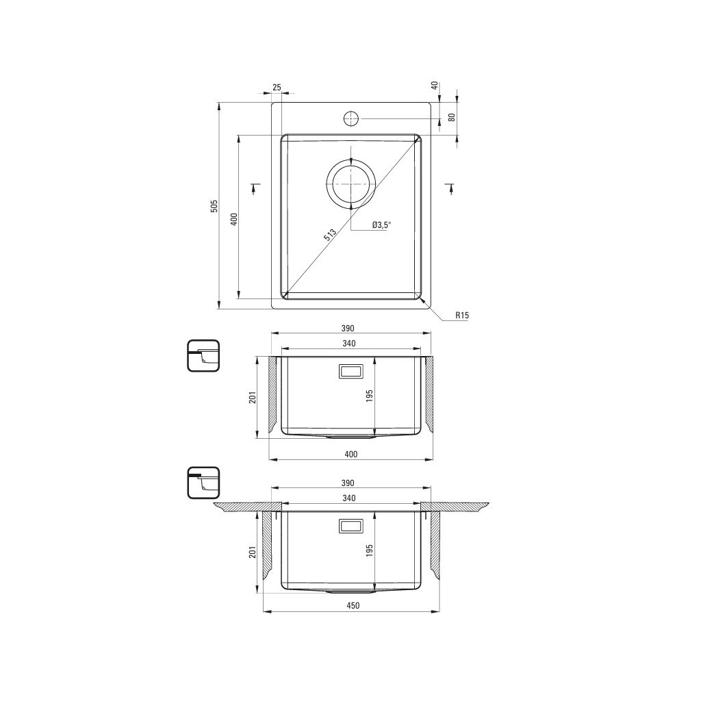 - Spôsob inštalácie: pod pultom, v jednej rovine s doskou, zapustením do pracovnej dosky zhora
