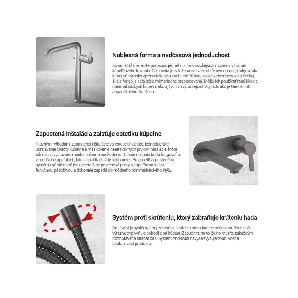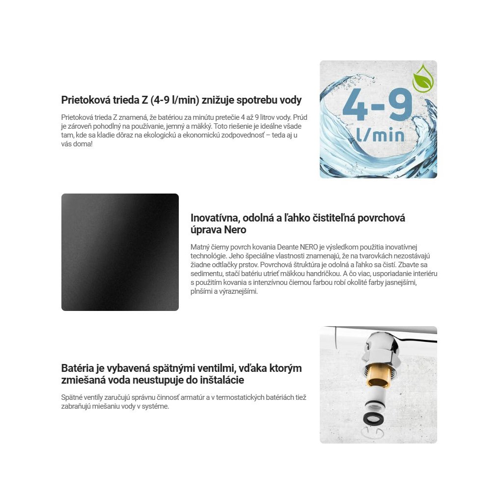 Matný čierny povrch kovania Deante NERO je výsledkom použitia inovatívnej technológie. Jeho špeciálne vlastnosti znamenajú, že na tvarovkách nezostávajú žiadne odtlačky prstov. Povrchová štruktúra je odolná a ľahko sa čistí. Zbavte sa sedimentu, stačí batériu utrieť mäkkou handričkou. A čo viac, usporiadanie interiéru s použitím kovania s intenzívnou čiernou farbou robí okolité farby jasnejšími, plnšími a výraznejšími.
