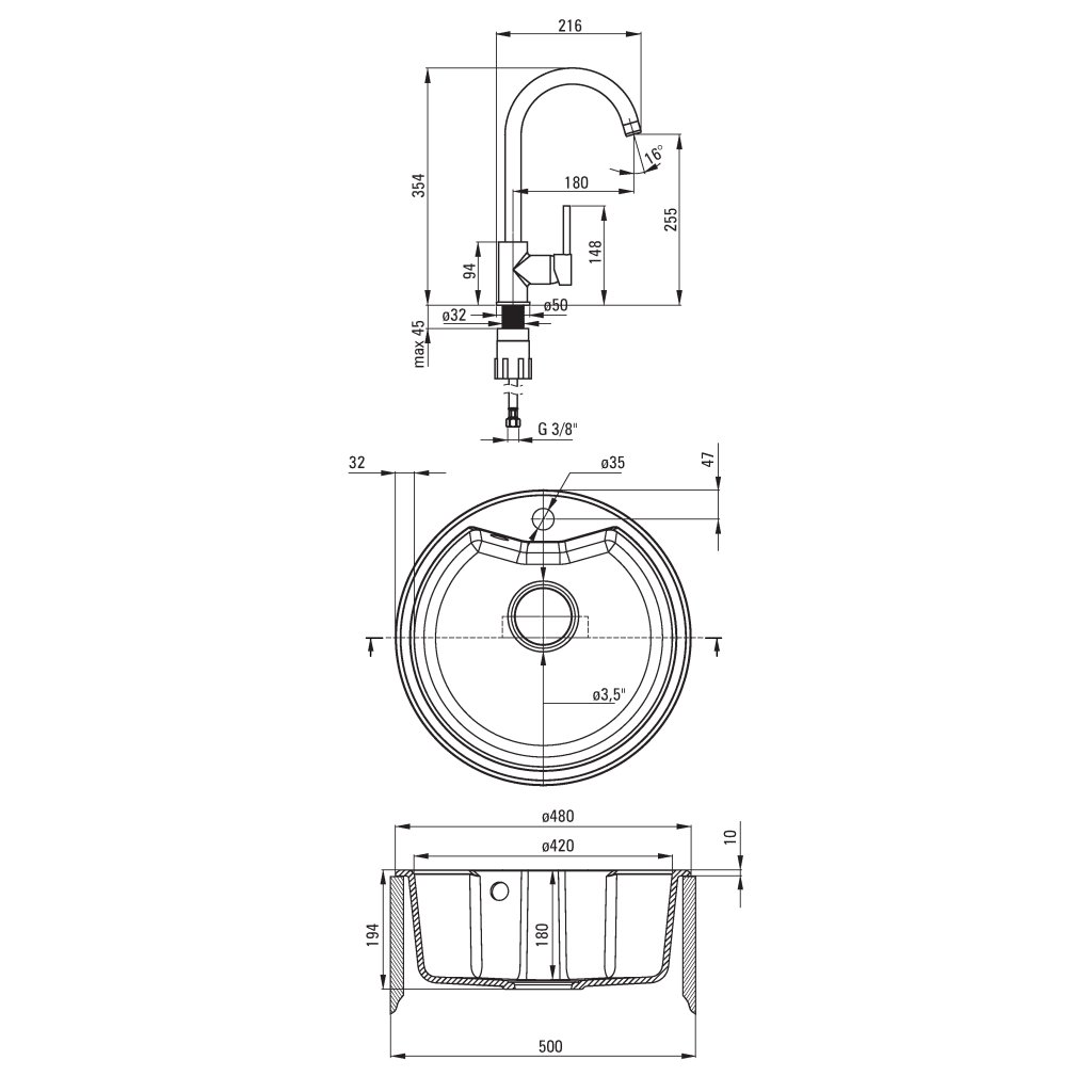 Deante Solis, granitový drez 480x480x194 + sifón + Nemezja batéria, 1-komorový, grafitová, ZRSB2803