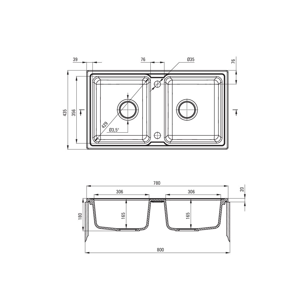 Deante Zorba, granitový drez 780x435x180 mm B/O, 3,5" + priestorovo úsporný sifón, 2-komorový, grafitová metalíza, ZQZ_G203