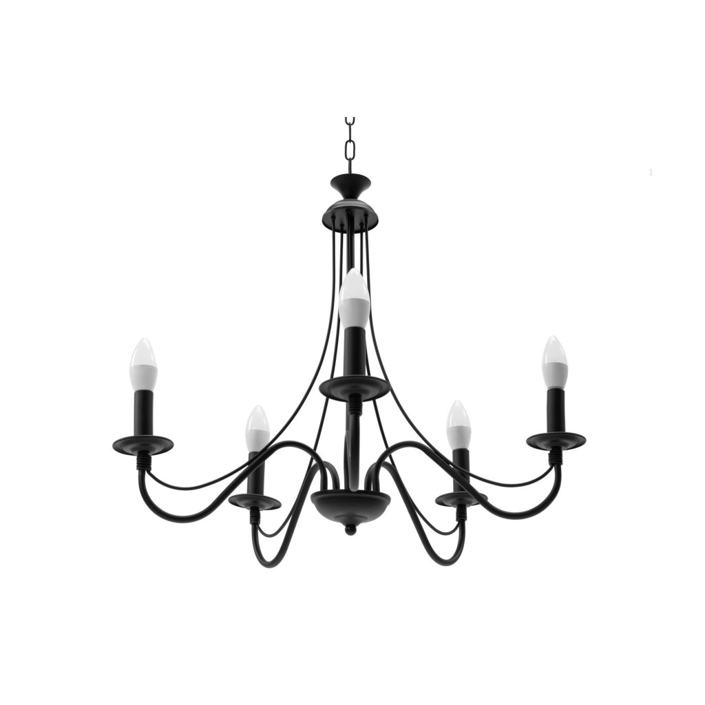 Lampa má 5 svietnikov, ramien a kovovú mriežku na strope. Každý svietnik má niť žiarovky E14