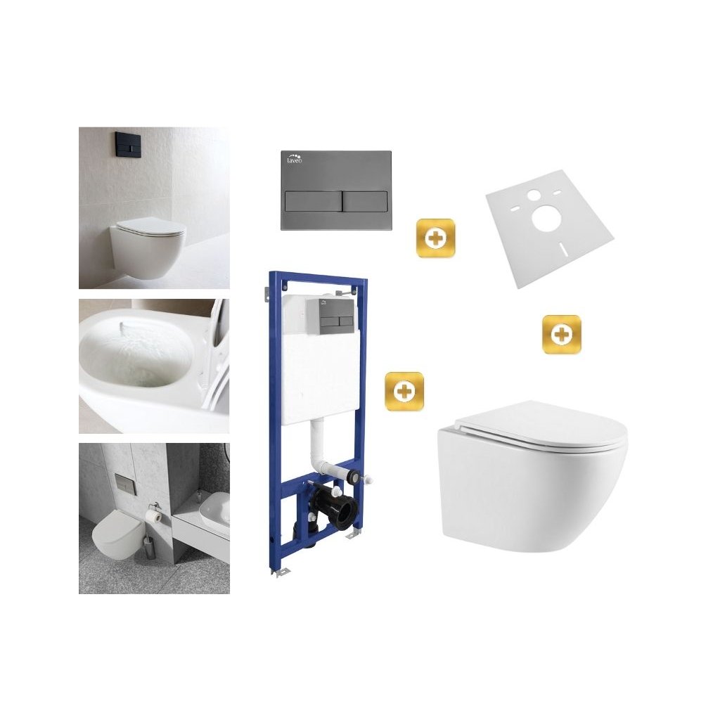 Erga, závesný set pod omietku Laveo Akan + závesná WC misa Lily+ s toaletným sedadlom z duroplastu + grafitové splachovacie tlačidlo