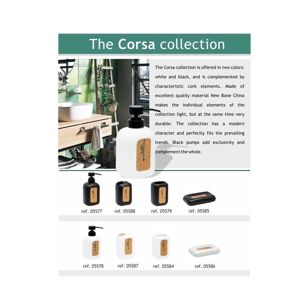 Mydelnička Corsa je vyrobená z kvalitnej keramiky a doplnená o charakteristické korkové prvky. Vďaka spracovaniu je kolekcia ľahká, no zároveň veľmi odolná.