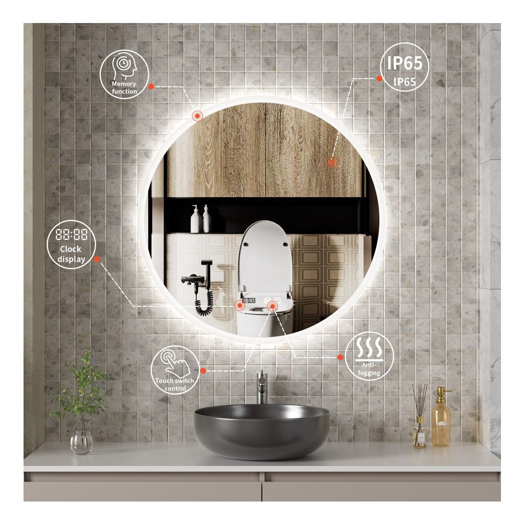 • Toto LED zrkadlo je stmievateľné, ovládané spínačom dotykového senzora. Jednoducho stlačte tlačidlo vypínača napájania na 2-3 sekundy a upravte jas z 10% na 100%. Nastavenia jasu sa ukladajú automaticky, takže jas nemusíte zakaždým upravovať.