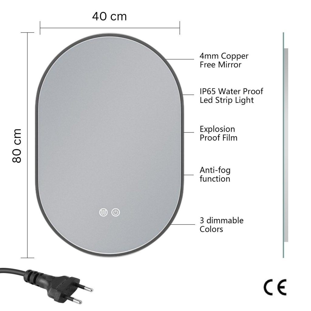 Erga Freya, oválne LED zrkadlo 40x80cm v čiernom kovovom ráme, 3 farby svetla, zadné osvetlenie, vyhrievacia podložka proti zapareniu, ERG-V01-FREYA-4080-BK