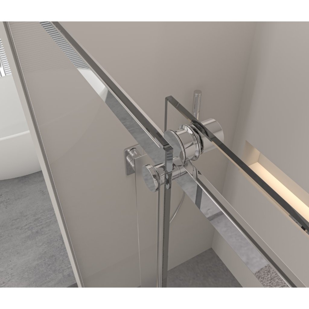 | Pevná kovová rukoväť | Pevné držadlo sprchových dverí robené zo zliatiny zinku a hliníka zaručuje pohodlné otváranie a zatváranie. Farebné prevedenie zladené s profilom sprchovej zásteny dodá vašej kúpeľni bezchybnú eleganciu. | |