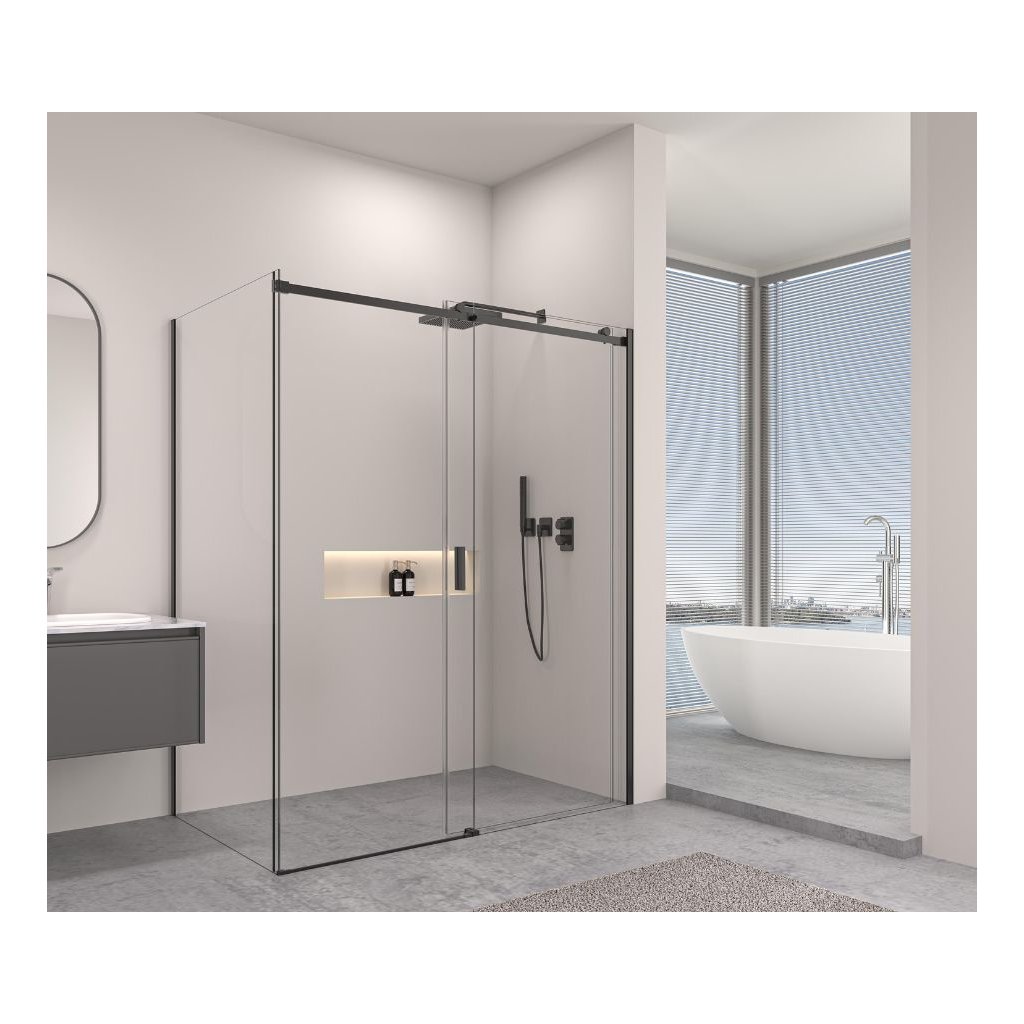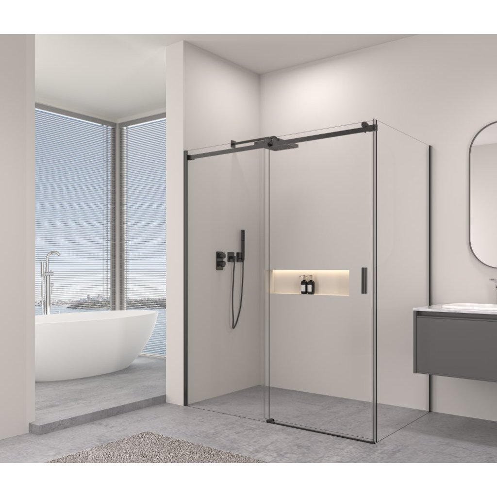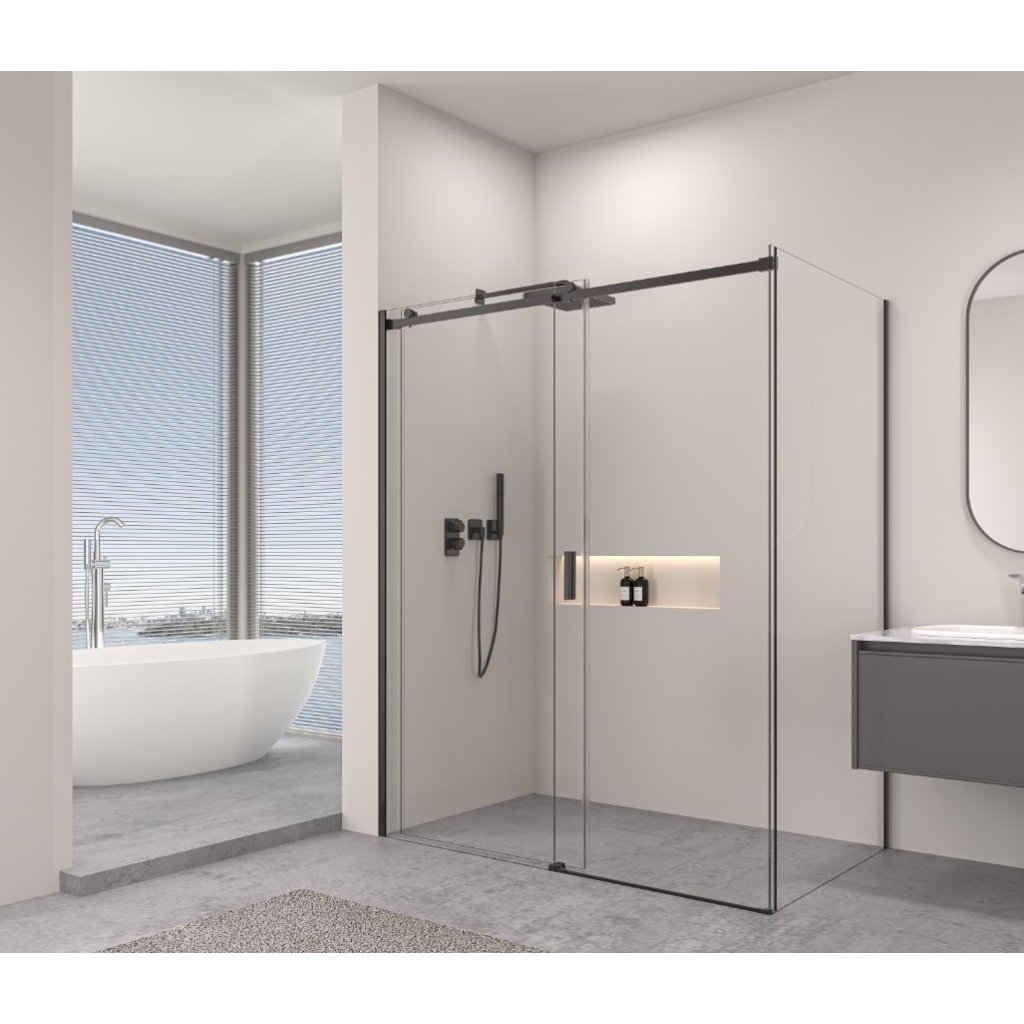 Erga Lynn, sprchový kút s posuvnými dverami 150(dvere) x 100(stena) x 195 cm, 8mm číre sklo, čierny profil, ERG-V02-LYNN-D150G100-CL-BK