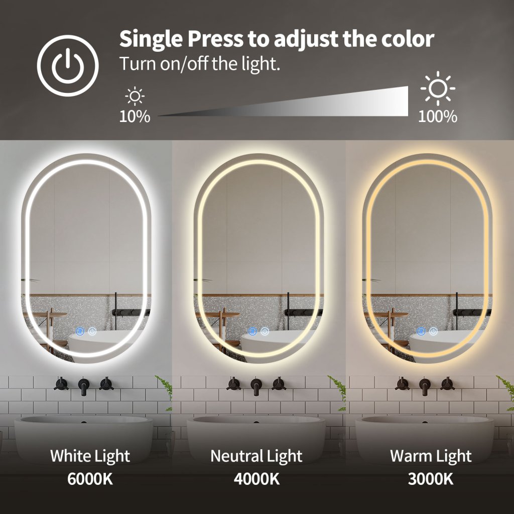 - Toto LED zrkadlo je stmievateľné, ovládané spínačom dotykového senzora. Jednoducho stlačte tlačidlo vypínača napájania na 2-3 sekundy a upravte jas z 10% na 100%. Nastavenia jasu sa ukladajú automaticky, takže jas nemusíte zakaždým upravovať.