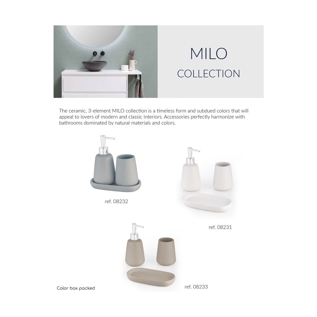 Keramická 3-prvková kolekcia MILO je nadčasovou formou a tlmenými farbami, ktoré oslovia milovníkov moderného aj klasického interiéru. Doplnky dokonale ladia s kúpeľňami, kde dominujú prírodné materiály a farby.