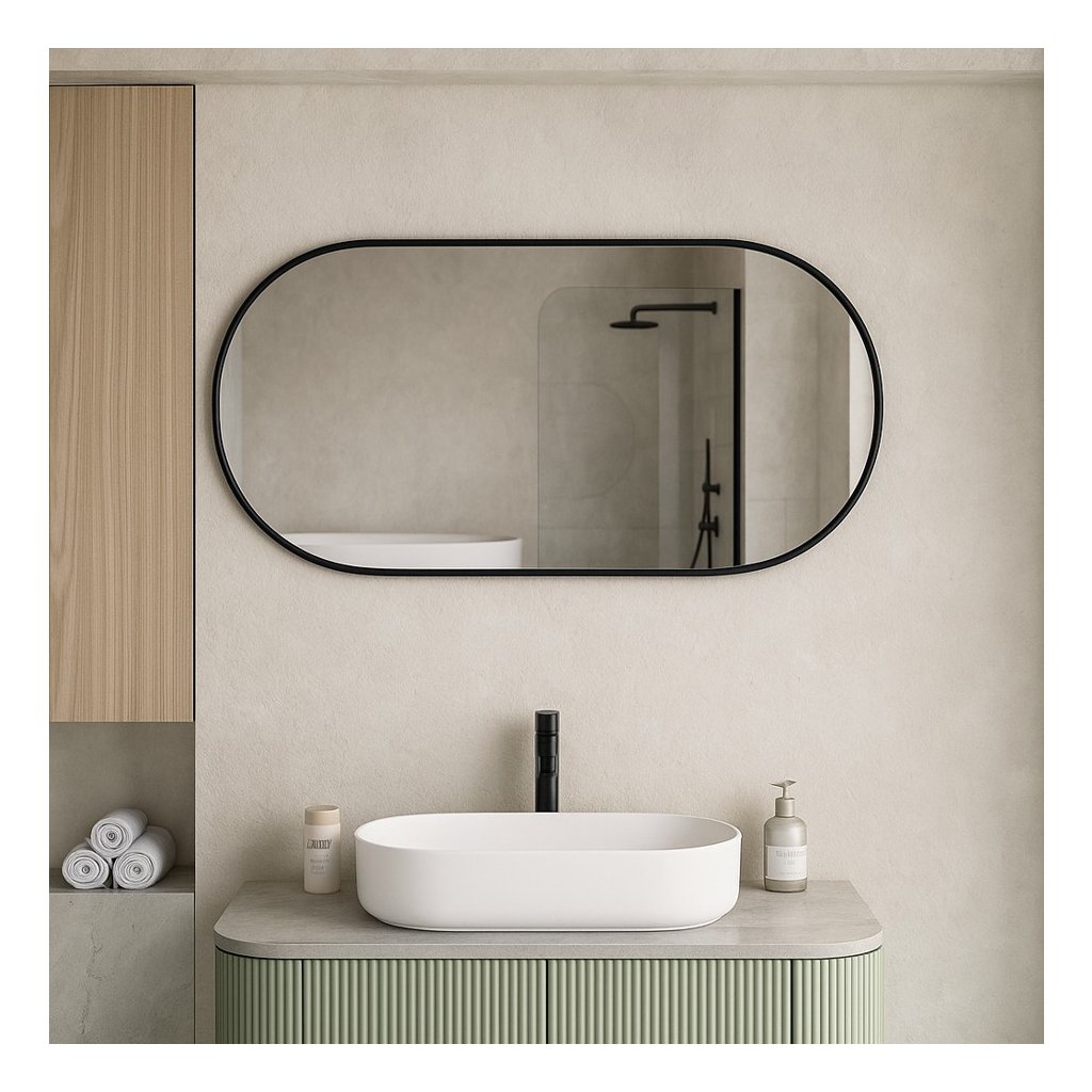 Oválny tvar: Hlavnou výhodou oválneho zrkadla v kúpeľni je, že zmäkčuje vizuálnu estetiku priestoru a dodáva mu organickejší a menej strohý vzhľad, najmä v porovnaní s tradičnými obdĺžnikovými alebo štvorcovými zrkadlami. Zakrivené okraje pomáhajú opticky zväčšiť menšie kúpeľne, pretože neoddeľujú stenu tak ostro ako hranaté rámy. Oválny tvar sa hodí k rôznym štýlom interiéru – od moderného minimalizmu, cez tradičný, až po art deco. Dobre sa kombinuje so zaoblenými líniami ostatného vybavenia, ako sú umývadlá alebo vane |