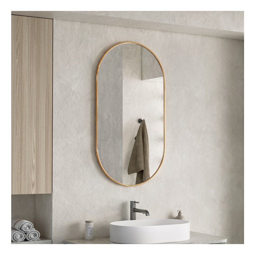 Oválny tvar: Hlavnou výhodou oválneho zrkadla v kúpeľni je, že zmäkčuje vizuálnu estetiku priestoru a dodáva mu organickejší a menej strohý vzhľad, najmä v porovnaní s tradičnými obdĺžnikovými alebo štvorcovými zrkadlami. Zakrivené okraje pomáhajú opticky zväčšiť menšie kúpeľne, pretože neoddeľujú stenu tak ostro ako hranaté rámy. Oválny tvar sa hodí k rôznym štýlom interiéru – od moderného minimalizmu, cez tradičný, až po art deco. Dobre sa kombinuje so zaoblenými líniami ostatného vybavenia, ako sú umývadlá alebo vane |