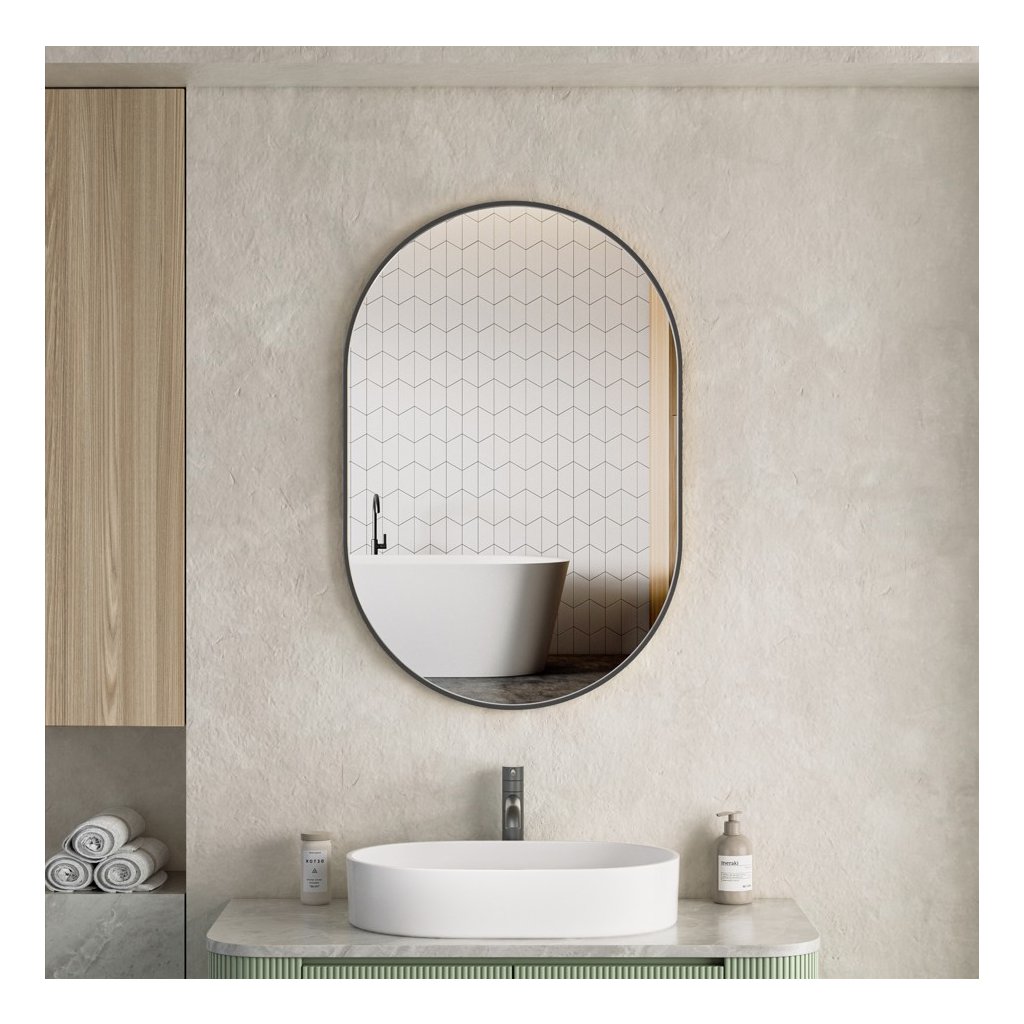 Oválny tvar: Hlavnou výhodou oválneho zrkadla v kúpeľni je, že zmäkčuje vizuálnu estetiku priestoru a dodáva mu organickejší a menej strohý vzhľad, najmä v porovnaní s tradičnými obdĺžnikovými alebo štvorcovými zrkadlami. Zakrivené okraje pomáhajú opticky zväčšiť menšie kúpeľne, pretože neoddeľujú stenu tak ostro ako hranaté rámy. Oválny tvar sa hodí k rôznym štýlom interiéru – od moderného minimalizmu, cez tradičný, až po art deco. Dobre sa kombinuje so zaoblenými líniami ostatného vybavenia, ako sú umývadlá alebo vane |