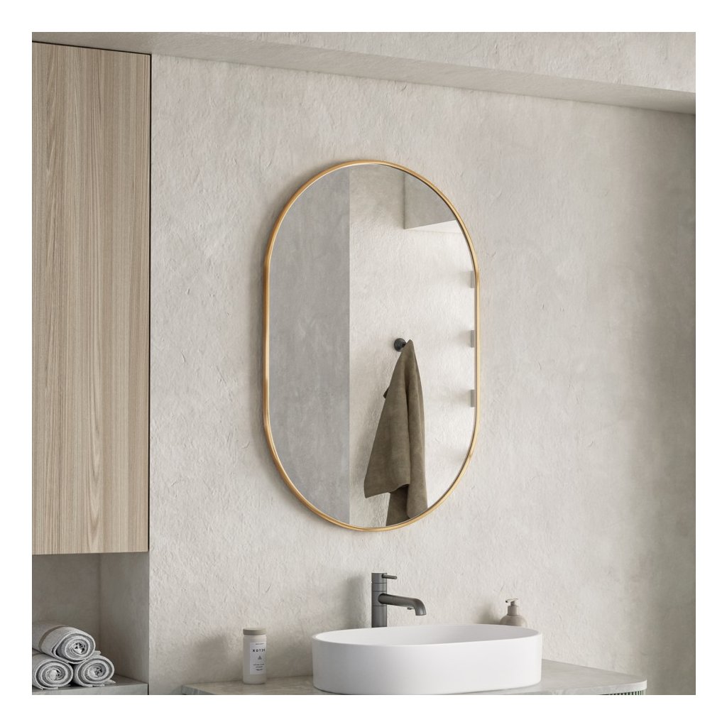 Oválny tvar: Hlavnou výhodou oválneho zrkadla v kúpeľni je, že zmäkčuje vizuálnu estetiku priestoru a dodáva mu organickejší a menej strohý vzhľad, najmä v porovnaní s tradičnými obdĺžnikovými alebo štvorcovými zrkadlami. Zakrivené okraje pomáhajú opticky zväčšiť menšie kúpeľne, pretože neoddeľujú stenu tak ostro ako hranaté rámy. Oválny tvar sa hodí k rôznym štýlom interiéru – od moderného minimalizmu, cez tradičný, až po art deco. Dobre sa kombinuje so zaoblenými líniami ostatného vybavenia, ako sú umývadlá alebo vane |