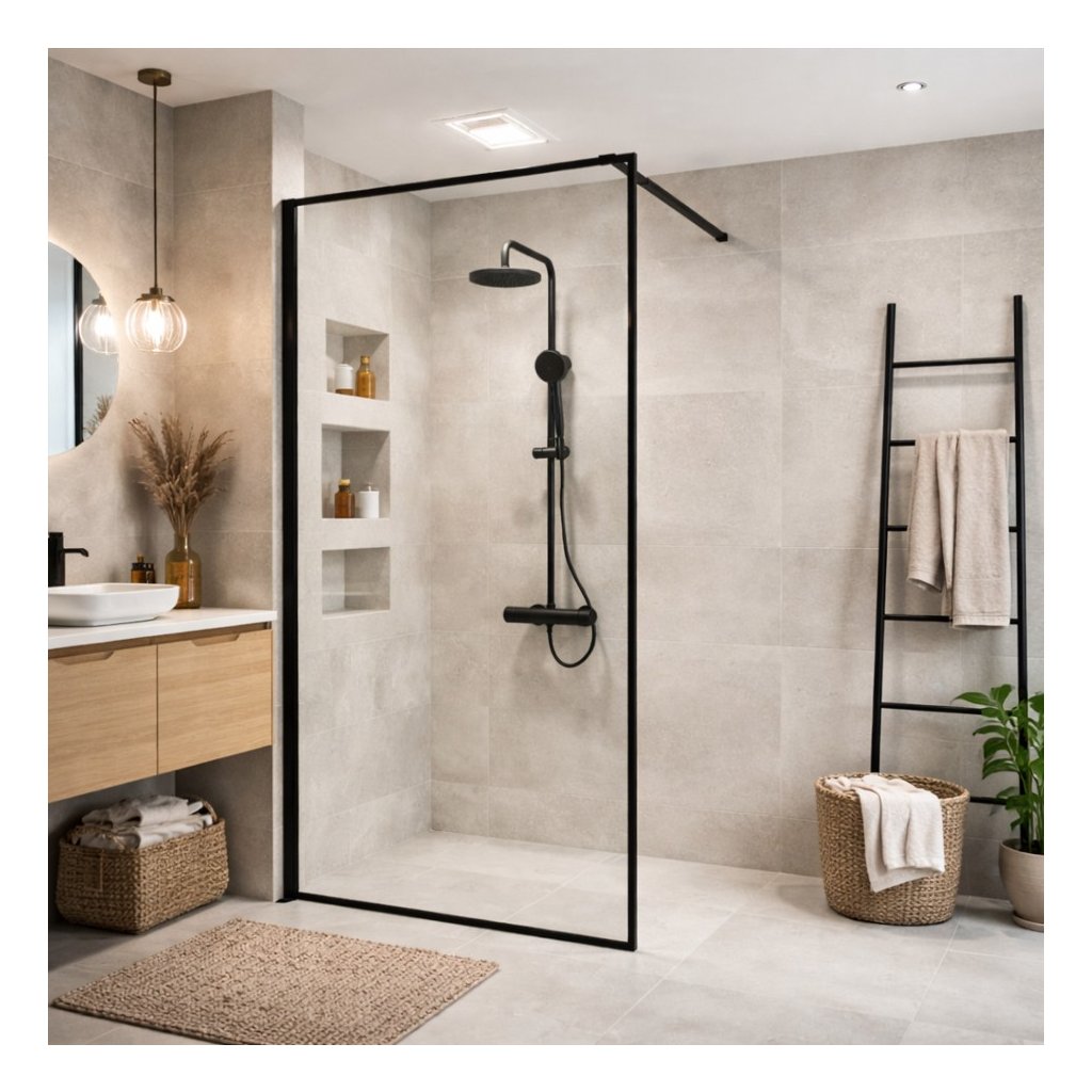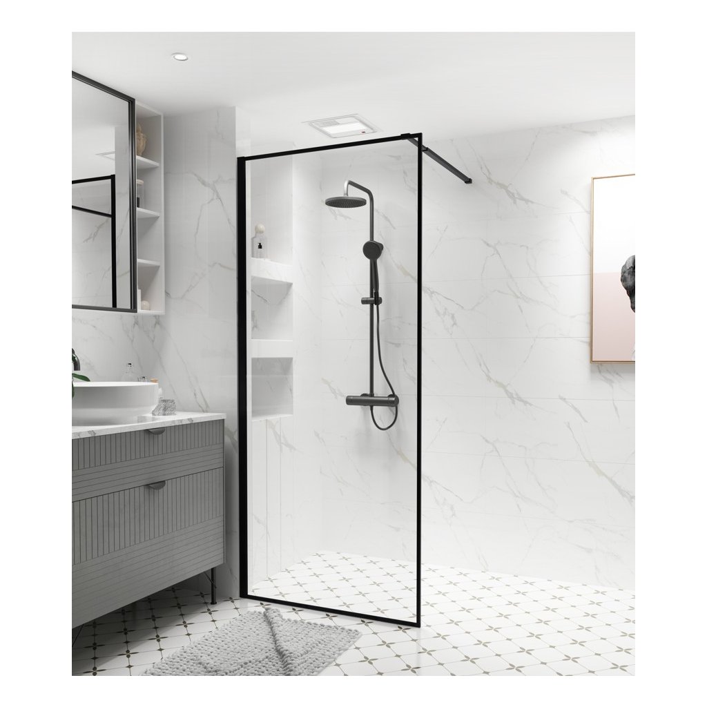 - Typ: sprchová zástena WALK-IN v čiernom kovovom ráme.