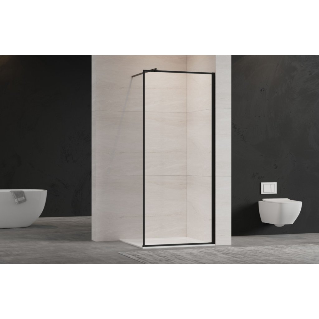 - Typ: sprchová zástena WALK-IN v čiernom kovovom ráme.