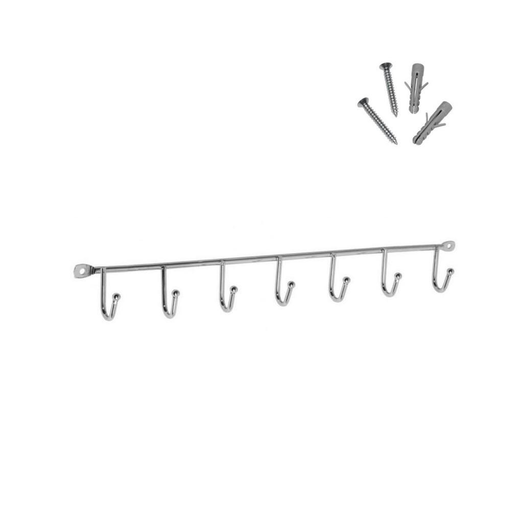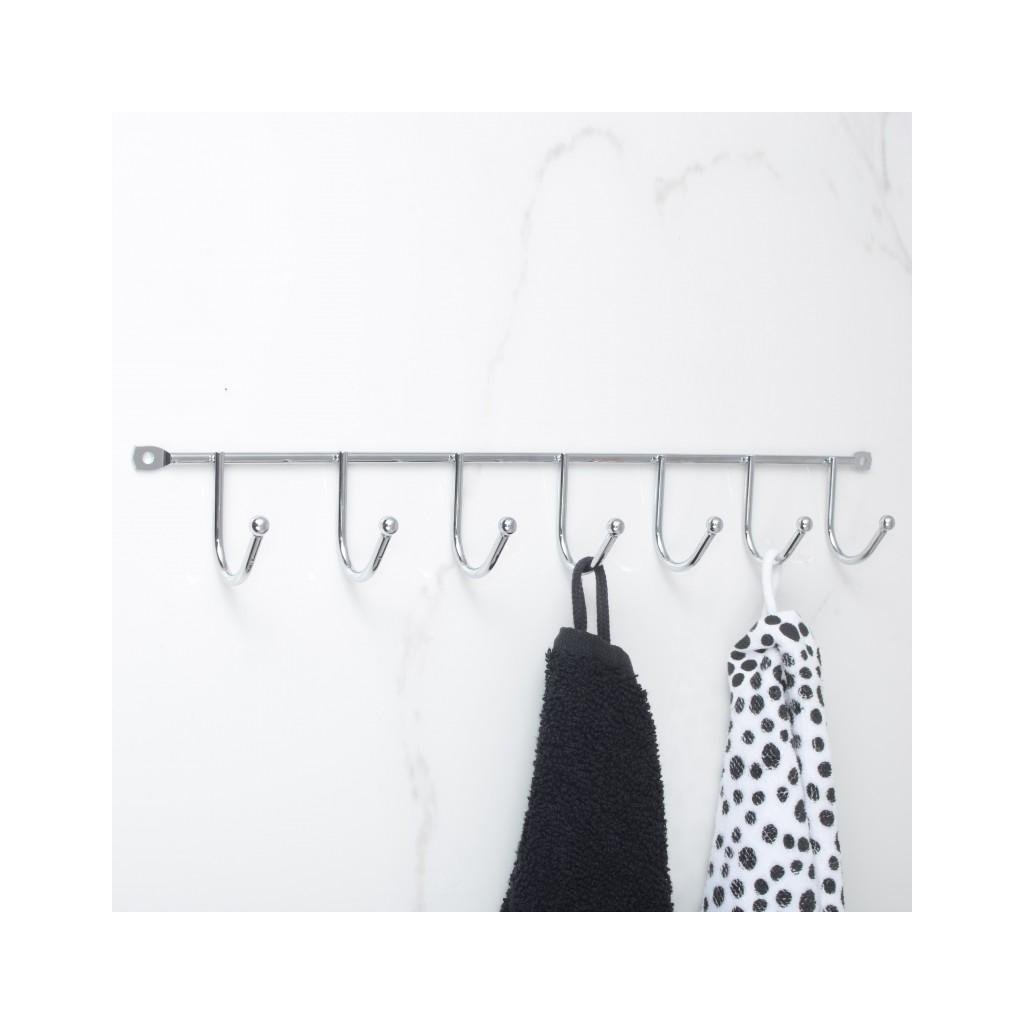 Kúpeľňový vešiak na uteráky, namontovaný na stenu pomocou hmoždiniek do steny (sú súčasťou balenia). Má sedem háčikov. Je vyrobený z oceľového drôtu, podrobený 3-stupňovému chrómovaniu. Praktické a odolné riešenie. Držiak nie je vhodný len do kúpeľne. Zapadá do moderného alebo klasicky dokončeného interiéru.