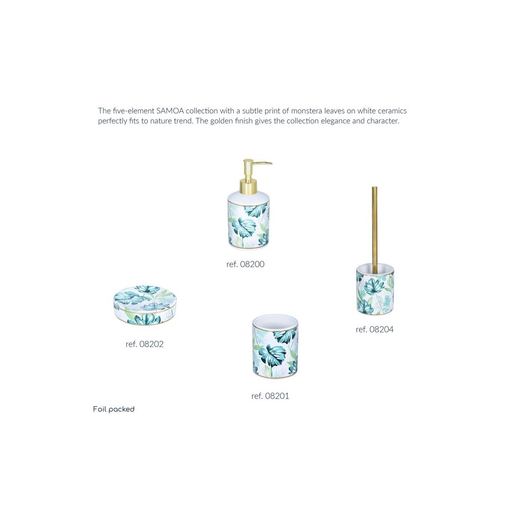 Rastlinné motívy zachvátili naše domovy a sú neustále obľúbené a vyvolávajú spomienky na horúce prázdniny. Do tohto trendu dokonale zapadá mydelnička z kolekcie SAMOA s jemnou potlačou listov na bielej keramike. Zlaté prevedenie dodáva kolekcii eleganciu a charakter.