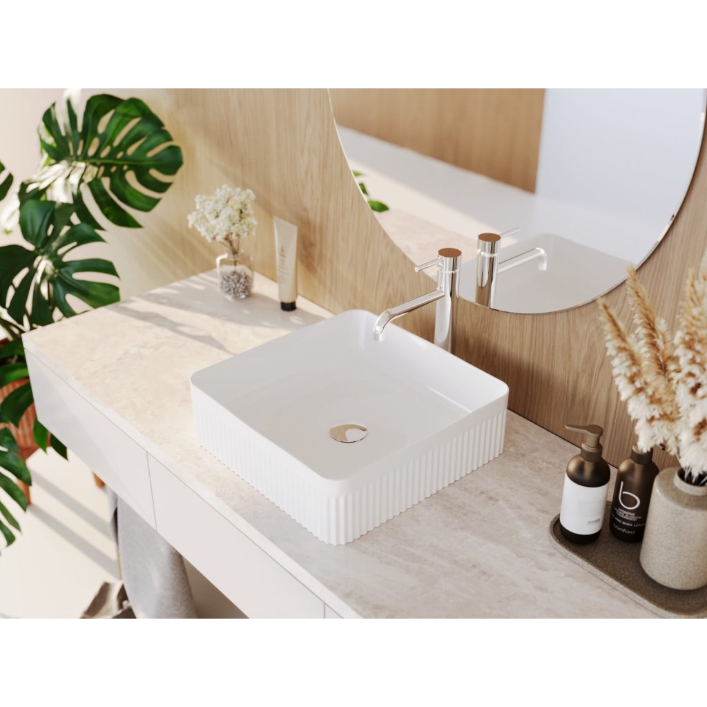 Vytvorte z vašej kúpeľne miesto plné harmónie a štýlu s umývadlom na dosku FREZJA K. Jeho jemne zaoblený, nepravidelný tvar inšpirovaný prirodzenými líniami dodáva interiéru ľahkosť a nadčasovú eleganciu. Ide o dizajn, ktorý prirodzene zapadne do moderných aj minimalistických kúpeľní. Umývadlo je vyrobené z kvalitnej keramiky, ktorá zaručuje odolnosť, jednoduchú údržbu a stále krásny vzhľad. Rýhované boky podčiarkujú jeho moderný charakter a pridávajú mu subtílny dekoratívny detail, vďaka ktorému pôsobí ešte sofistikovanejšie.