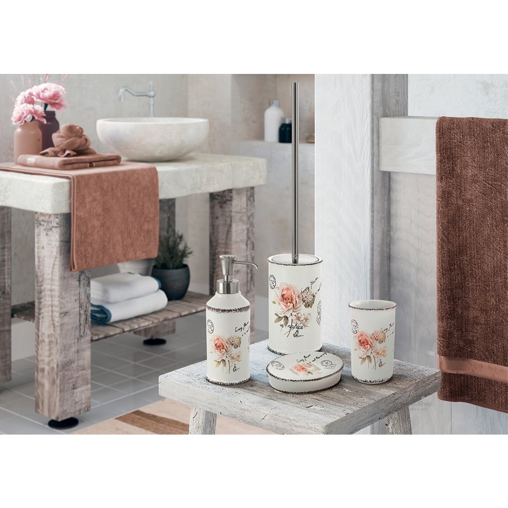 Nežný kvetinový dekor a prevedenie na pohľad pôsobiace dojmom plechových nádobiek kúpeľňových doplnkov CLOTHILDE z keramiky poteší v kúpeľni zariadenej v retro štýle.