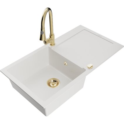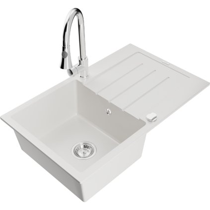 Mexen Leo, 1-komorový granitový drez 900x500x190 mm a drezová batéria Elia, biela, 6501-20-670101-50
