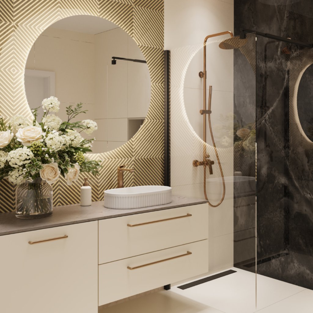 Oválne umývadlo na dosku Glamour má vďaka svojej dekoratívnej drážke okrem praktickej funkcie aj dekoratívnu funkciu. Krásne ladí na pozadí čiernej kamennej steny s výrazným žilkovaním sprevádzaným zlatou vzpriamenou batériou a tmavou zrkadlovou doskou Perfektne bude fungovať aj v monochromatickom svetlom interiéri s bielymi, veľkoformátovými dlaždicami s vysokým leskom. Oválne biele drážkované umývadlo na dosku Glamour je možné použiť aj v pastelovom interiéri, kde je priestor pre púdrovú ružovú, olivovo zelenú a morskú modrú. Fluting je tiež veľkou inšpiráciou pre vytvorenie 3D steny, vďaka ktorej nadobudne celý interiér trojrozmerný formát. Jeho jemný tvar, nadčasová biela a výrazná drážka robia z oválneho umývadla na dosku Glamour vznešený kúpeľňový nábytok. Je originálny a univerzálny zároveň, ale vždy jasne označuje svoju prítomnosť v interiéri.