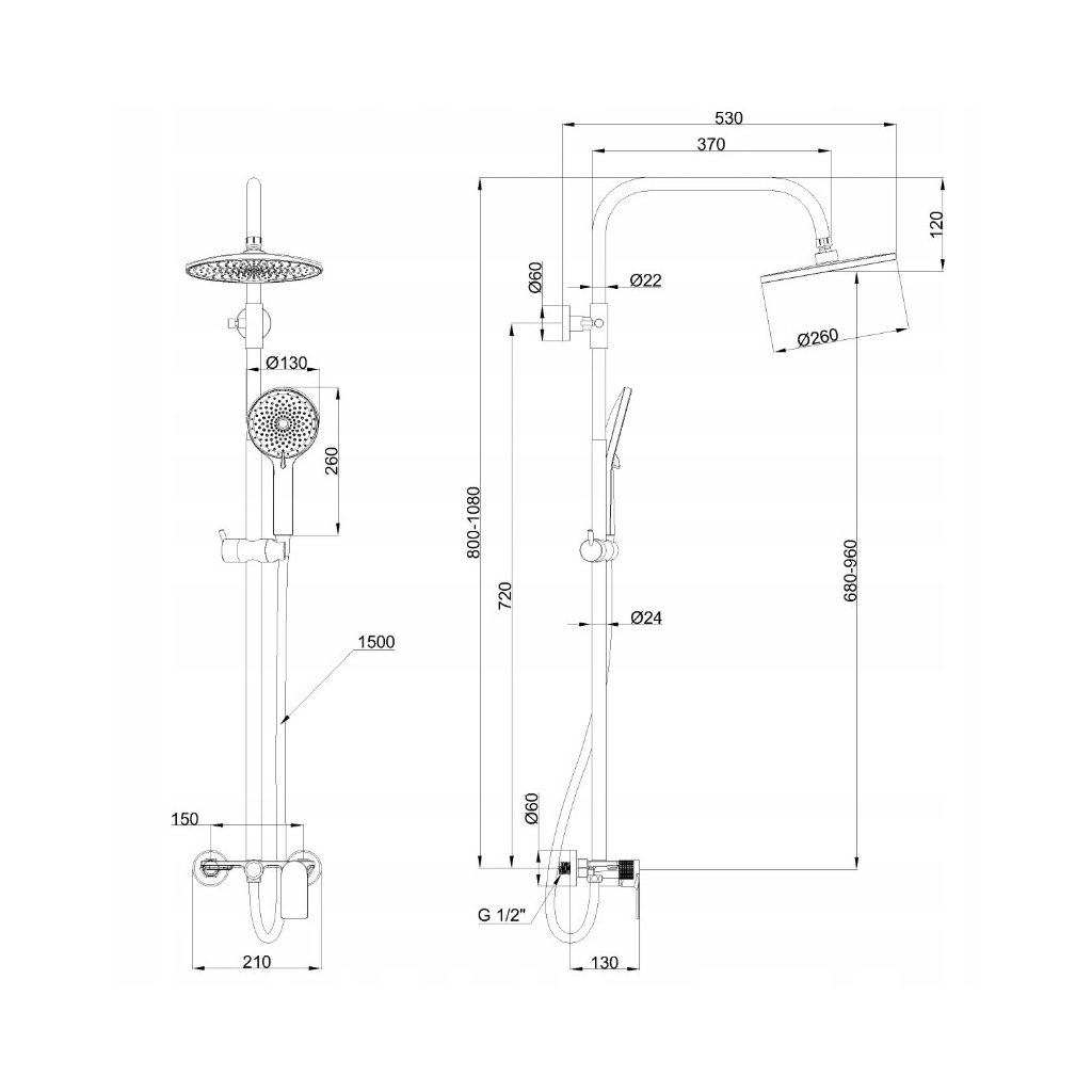 Sprchový stĺp s nastaviteľnou výškou, od 80 do 108 cm. Horný pohyblivý abs, okrúhly, 22,5 cm, s anti-calc systémom – umožňuje jednoduché odstránenie vodného kameňa z postrekových bodov. Ručný 3-funkčný postrek (normálny, zmiešaný prúd, bič) O 12 cm, so systémom anti-calc. Posuvný držiak nastaviteľný tlačidlom – zaisťuje pohodlné používanie. 3-funkčná batéria – tri funkcie odtoku vody: z dažďovej sprchy, sprchovej hlavice, výtoku zabudovaného do batérie. Plochá konštrukcia batérie môže zároveň predstavovať funkčnú poličku na kozmetiku. Integrovaný prepínač funkcií v batérii. Sprchová hadica z nehrdzavejúcej ocele s dvojitou väzbou, dĺžka 150 cm, anti-twist. Farba: čierna