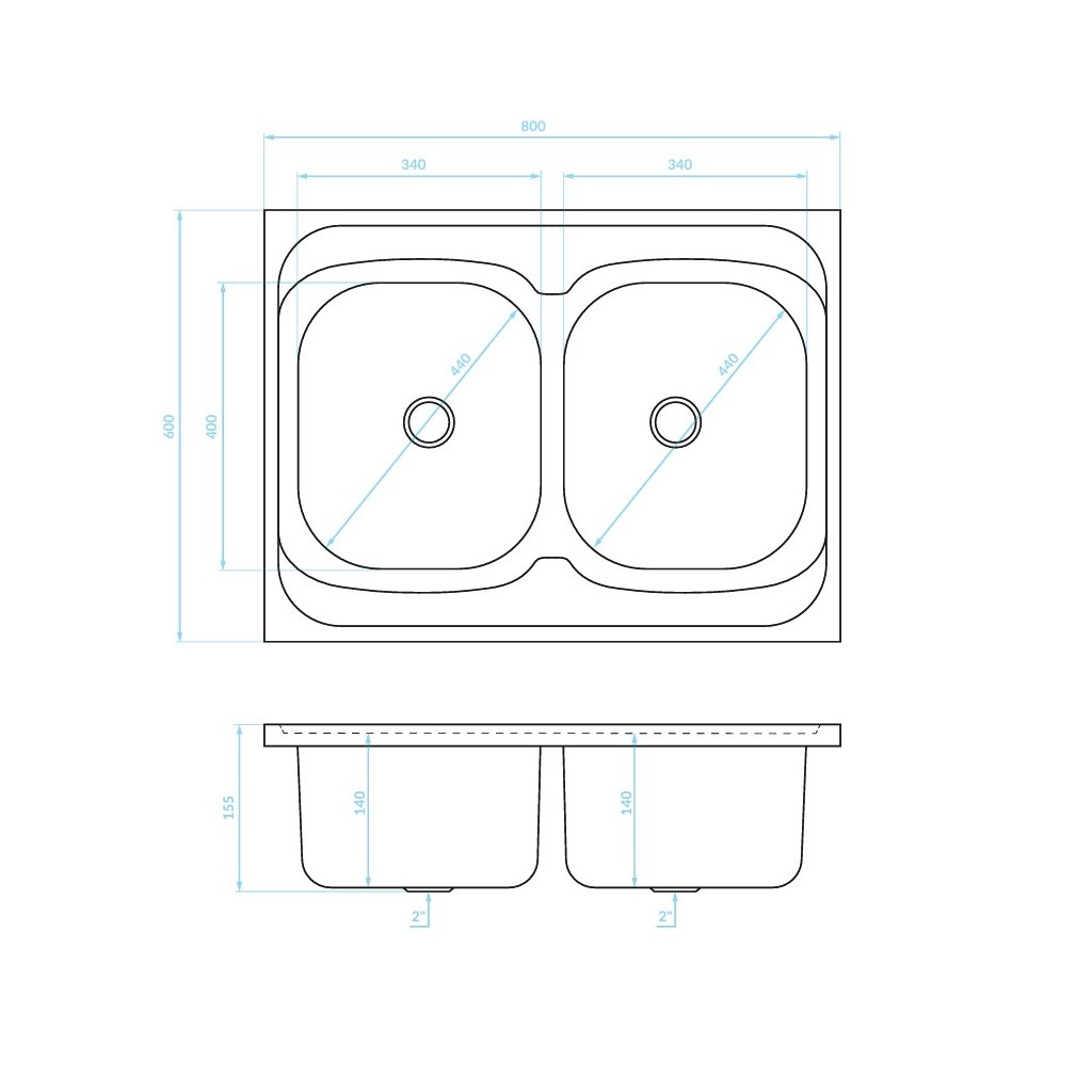 Kuchinox, 2-komorový nerezový drez 800x600x155 mm na položenie na skrinku, hladký dekor, oceľová, LAV-SK2_020T