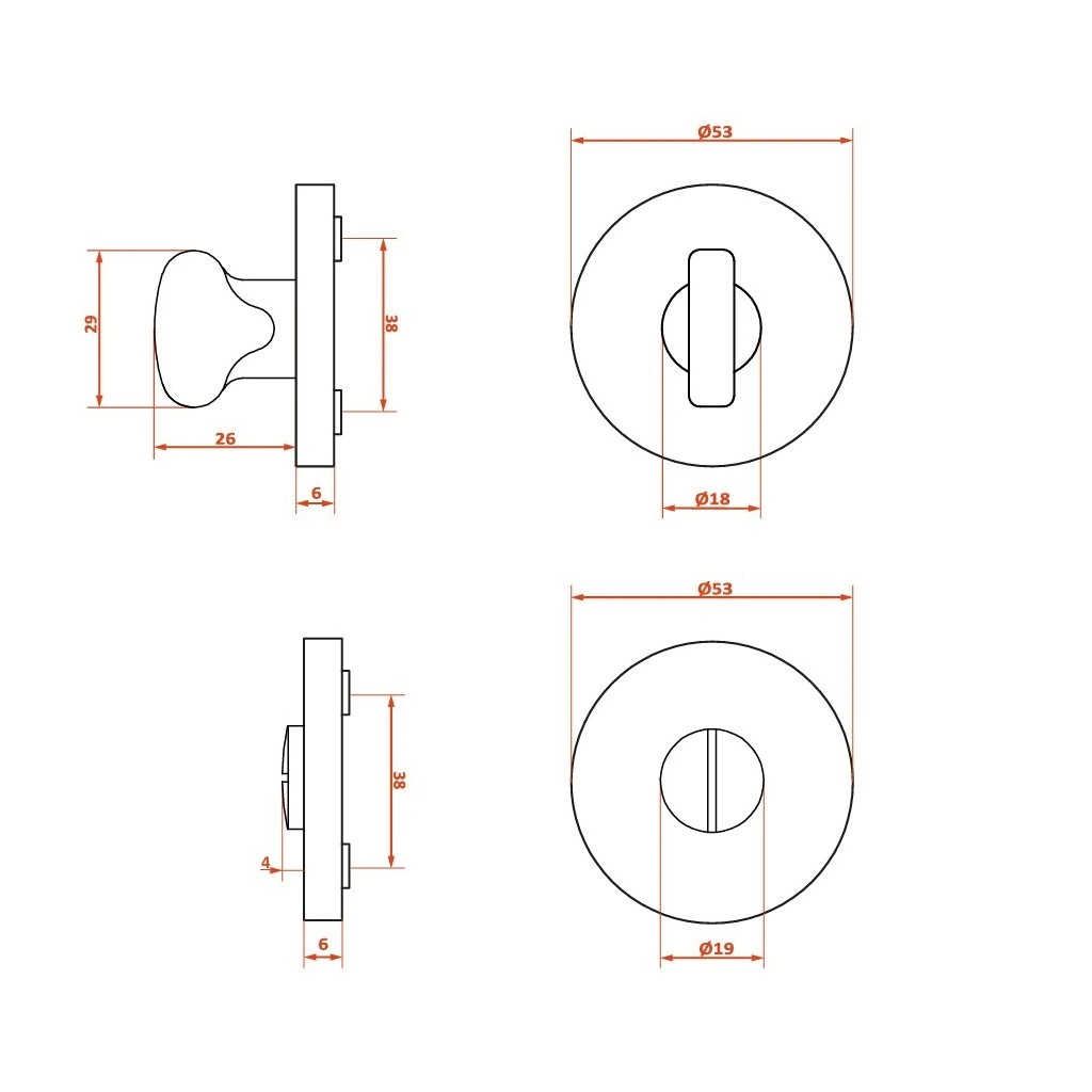 Rozeta je navrhnutá pre interiérové dvere s hrúbkou 38-45 mm a má rozstup montážnych otvorov 38 mm. V balení je zahrnutý kompletný montážny materiál, takže inštalácia je rýchla a bezproblémová. Kompaktné rozmery 53x6 mm robia z tejto rozety ideálnu voľbu pre priestory, kde je potrebné šetriť miestom bez kompromisov v kvalite a funkčnosti.