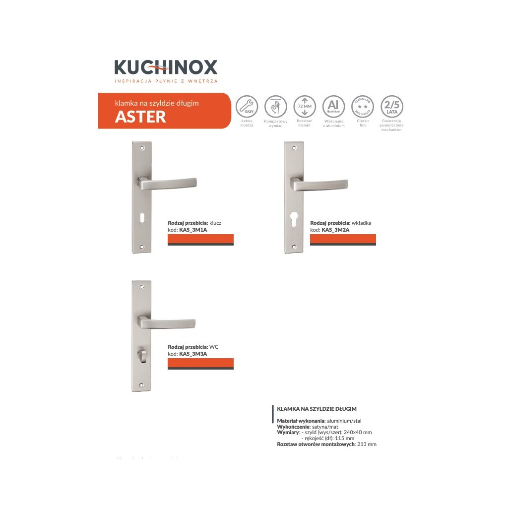 Kuchinox Aster, kľučka na dvere na dlhom kovaní pre cylindrickú vložku, satén matný, LAV-KAS_3M2A