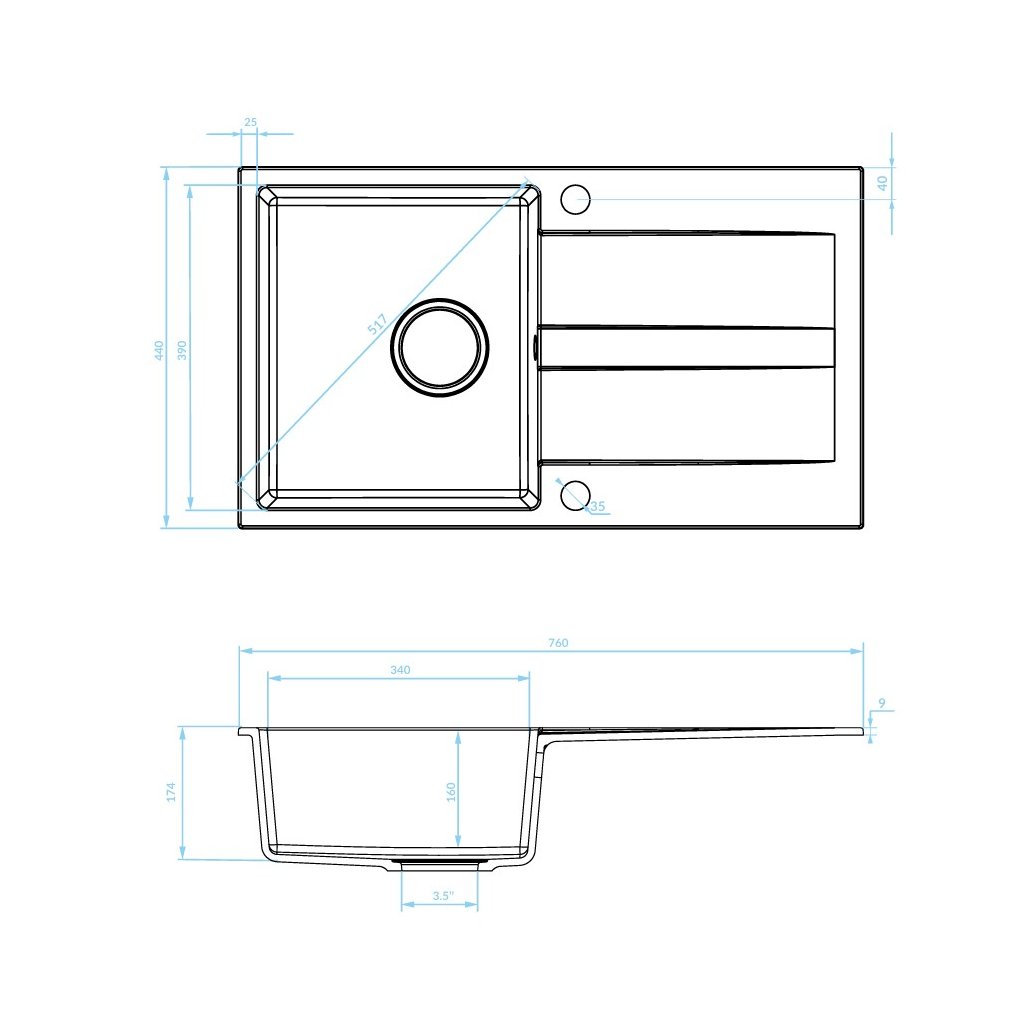 Kuchinox Laut, 1-komorový granitový drez 760x440x174 mm + sifón, čierna, LAV-SBZ_B11Y