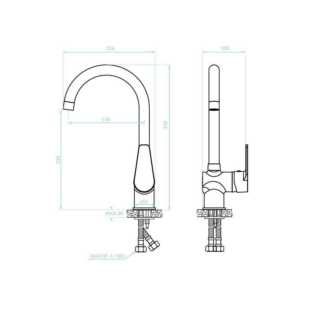Stojanková drezová batéria Luga predstavuje dokonalé spojenie moderného dizajnu s praktickými vlastnosťami. Výška 338 mm a pohyblivý U-tvar výtoku zabezpečujú pohodlné napĺňanie vysokých nádob aj dôkladné umývanie drezu. Jednopákové ovládanie umožňuje presné a rýchle nastavenie požadovanej teploty vody.